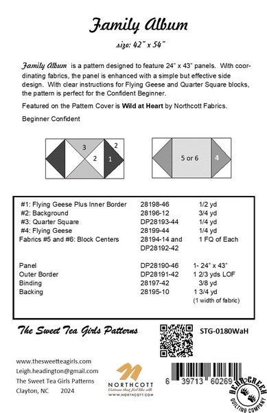 Family Album Quilt Pattern View Larger Image Price: SALE $9.79 1 item(s) available. Item # PTN-3497 | Reg. $13.99 Tweet Pin It Family Album Quilt PatternFeaturing the Naturescapes Wild At Heart fabric collection by Northcott. Pattern and instructions; fabric not included Finished size is 42 inches by 54 inches Designed by Leigh Headington Published by The Sweet Tea Girls Patterns Copyright 2025