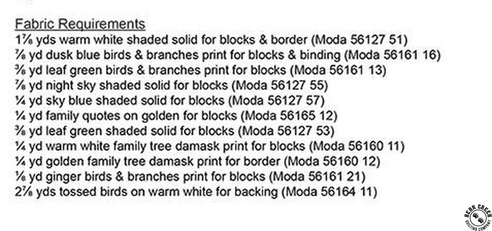 Family Grove Quilt Pattern View Larger Image Price: $11.99 12 item(s) available. Item # PTN-CHD2525 Pin It Family Grove Quilt PatternFeaturing the Family Tree fabric collection by Moda Pattern and instructions; fabric not included Finished size is 44 inches by 61 inches Designed by Barb Cherniwchan Published by Coach House Designs Copyright 2026 Related Products Family Tree Charm Pack by Moda Item # 56160PP $12.99 Family Tree Fat Quarter Bundle by Moda Item # 56160AB $144.99 Family Tree Jelly Roll by Moda Item # 56160JR $49.99 Family Tree Layer Cake by Moda Item # 56160LC $49.99 Moda Family Tree Birds and Branches Monotone Dusk Item # 56161-16 $0.00 Moda Family Tree Birds and Branches Monotone Ginger Item # 56161-21 $0.00 Moda Family Tree Birds and Branches Monotone Leaf Item # 56161-13 $0.00 Moda Family Tree Birds and Branches Monotone Mist Item # 56161-18 $0.00 Moda Family Tree Birds and Branches Monotone Warm White Item # 56161-11 $0.00 Moda Family Tree Damask Dusk Item # 56160-16 $0.00 Moda Family Tree Damask Eucalyptus Item # 56160-14 $0.00 Moda Family Tree Damask Golden Item # 56160-12 $0.00 Moda Family Tree Damask Night Sky Item # 56160-15 $0.00 Moda Family Tree Damask Warm White Item # 56160-11 $0.00 Moda Family Tree Family Quote Golden Item # 56165-12 $0.00 Moda Family Tree Family Quote Warm White Item # 56165-11 $0.00 Moda Family Tree Family Quote Warm White/Tonal Item # 56165-21 $0.00 Moda Family Tree Leaves and Branches Eucalyptus Item # 56162-14 $0.00 Moda Family Tree Leaves and Branches Night Sky Item # 56162-15 $0.00 Moda Family Tree Leaves and Branches Warm White Item # 56162-11 $0.00 Moda Family Tree Panel Night Sky Item # 56166-15 $0.00 Moda Family Tree Panel Warm White Item # 56166-11 $0.00 Moda Family Tree Shaded Solid Leaf Item # 56127-53 $0.00 Moda Family Tree Shaded Solid Night Sky Item # 56127-55 $0.00 Moda Family Tree Shaded Solid Sky Item # 56127-57 $0.00 Moda Family Tree Shaded Solid Warm White Item # 56127-51 $0.00 Moda Family Tree Tossed Birds Mist Item # 56164-18 $0.00 Moda Family Tree Tossed Birds Night Sky Item # 56164-15 $0.00 Moda Family Tree Tossed Birds Warm White Item # 56164-11 $0.00 Moda Family Tree Trees in a Row Eucalyptus Item # 56163-14 $0.00 Moda Family Tree Trees in a Row Night Sky Item # 56163-15 $0.00 Moda Family Tree Trees in a Row Warm White Item # 56163-11 $0.00 My Tree Quilt Pattern Item # PTN-CHD2527 $11.99