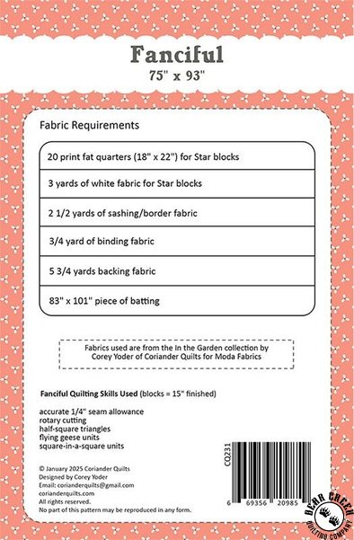 Fanciful Quilt Pattern View Larger Image Price: $11.99 8 item(s) available. Item # PTN-231 Pin It Fanciful Quilt PatternFeaturing the In The Garden fabric collection by Moda. Pattern and instructions; fabric not included Finished size is 75 inches by 93 inches Designed by Corey Yoder Published by Coriander Quilts Copyright 2025 Related Products Garden Melody Quilt Pattern Item # PTN-234 $11.99 In The Garden Charm Pack by Moda Item # 29230PP $12.99 In The Garden Fat Quarter Bundle by Moda Item # 29230AB $189.99 In The Garden Jelly Roll by Moda Item # 29230JR $49.99 In The Garden Layer Cake by Moda Item # 29230LC $49.99 Jelly Twinkle Quilt Pattern Item # PTN-233 $11.99 Moda In The Garden Bias Stripe Coral Item # 29237-25 $12.99 Moda In The Garden Bias Stripe Pistachio Item # 29237-20 $12.99 Moda In The Garden Bias Stripe Slate Item # 29237-23 $12.99 Moda In The Garden Bloom and Blossom Goldenrod Item # 29233-18 $12.99 Moda In The Garden Bloom and Blossom Light Lime Item # 29233-21 $12.99 Moda In The Garden Bloom and Blossom Stone Item # 29233-24 $12.99 Moda In The Garden Bloom and Blossom Strawberry Item # 29233-12 $12.99 Moda In The Garden Dotted Sprig Bermuda Item # 29232-22 $12.99 Moda In The Garden Dotted Sprig Light Lime Item # 29232-21 $12.99 Moda In The Garden Dotted Sprig Off White Item # 29232-11 $12.99 Moda In The Garden Dotted Sprig Strawberry Item # 29232-12 $12.99 Moda In The Garden Flowers Bermuda Item # 29230-22 $12.99 Moda In The Garden Flowers Coral Item # 29230-15 $12.99 Moda In The Garden Flowers Goldenrod Item # 29230-18 $12.99 Moda In The Garden Flowers Off White Item # 29230-11 $12.99 Moda In The Garden Flowers Slate Item # 29230-23 $12.99 Moda In The Garden Flutter Bermuda Item # 29236-22 $12.99 Moda In The Garden Flutter Coral Item # 29236-25 $12.99 Moda In The Garden Flutter Goldenrod Item # 29236-18 $12.99 Moda In The Garden Flutter Off White Item # 29236-11 $12.99 Moda In The Garden Flutter Slate Item # 29236-23 $12.99 Moda In The Garden Love Me Off White Item # 29235-11 $12.99 Moda In The Garden Love Me Slate Item # 29235-23 $12.99 Moda In The Garden Love Me Strawberry Item # 29235-12 $12.99 Moda In The Garden Sketch Coral Item # 29231-35 $12.99 Moda In The Garden Sketch Goldenrod Item # 29231-38 $12.99 Moda In The Garden Sketch Off White/White Item # 29231-31 $12.99 Moda In The Garden Sketch Stone Item # 29231-24 $12.99 Moda In The Garden Sugar Snap Bermuda Item # 29234-22 $12.99 Moda In The Garden Sugar Snap Slate Item # 29234-23 $12.99 Moda In The Garden Sugar Snap Stone Item # 29234-24 $12.99 Moda In The Garden Tiny Peel Bermuda Item # 29238-22 $12.99 Moda In The Garden Tiny Peel Coral Item # 29238-15 $12.99 Moda In The Garden Tiny Peel Goldenrod Item # 29238-18 $12.99 Moda In The Garden Tiny Peel Light Lime Item # 29238-21 $12.99 Moda In The Garden Tiny Peel Off White Item # 29238-31 $12.99 Moda In The Garden Tiny Peel Stone Item # 29238-24 $12.99 Moda In The Garden Tiny Peel Strawberry Item # 29238-12 $12.99