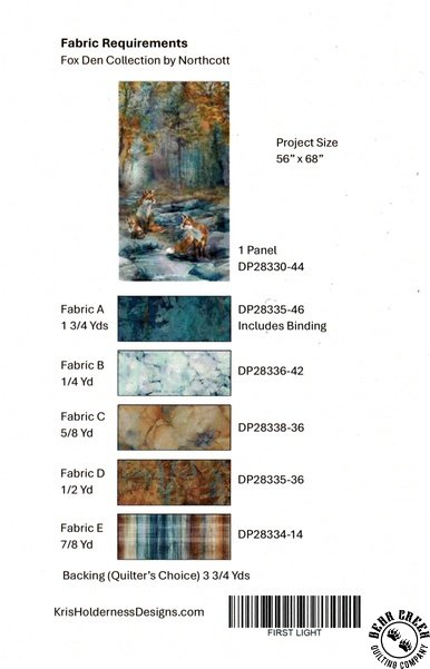 First Light Quilt Pattern View Larger Image Price: $11.99 3 item(s) available. Item # PTN-3523 Tweet Pin It First Light Quilt PatternFeaturing the Fox Den fabric collection by Northcott. Pattern and instructions; fabric not included Finished size is 56 inches by 68 inches Designed by Kris Holderness Published by Kris Holderness Designs Copyright 2025 Related Products Leash on Life Quilt Pattern Item # PTN-3524/BTBQ523 $13.99 Northcott Fox Den Fox Dense Blue/Multi Item # DP28332-44 $12.99 Northcott Fox Den Fox Open Beige/Multi Item # DP28333-14 $12.99 Northcott Fox Den Multi Texture Blue Item # DP28338-44 $12.99 Northcott Fox Den Multi Texture Rust Item # DP28338-36 $12.99 Northcott Fox Den Ombre Blue/Multi Item # DP28331-44 $12.99 Northcott Fox Den Panel Item # DP28330-44 $8.99 Northcott Fox Den Pine Needle Beige Item # DP28337-14 $12.99 Northcott Fox Den Plaid Beige/Multi Item # DP28334-14 $12.99 Northcott Fox Den Smooth Texture Dark Blue Item # DP28339-49 $12.99 Northcott Fox Den Stone Texture Light Blue Item # DP28336-42 $12.99 Northcott Fox Den Trees Dark Rust Item # DP28335-36 $12.99