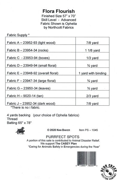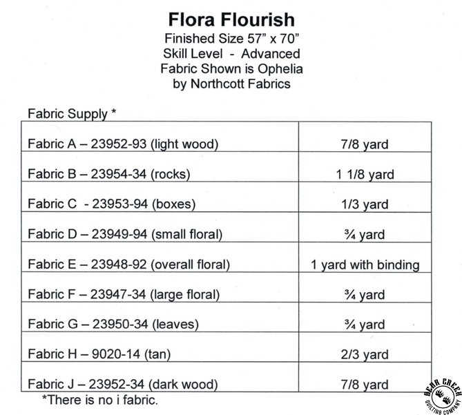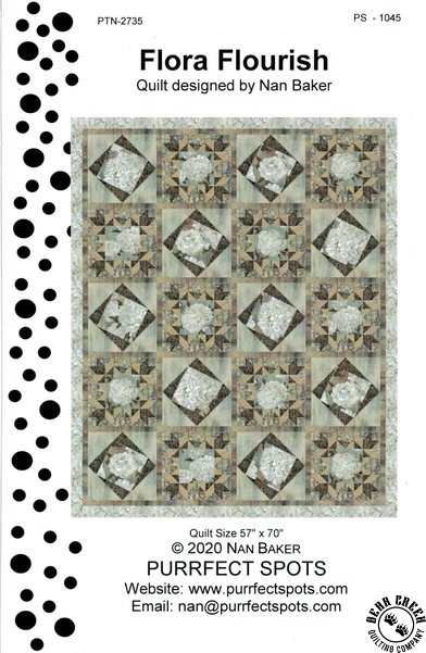 Flora Flourish Quilt Pattern View Larger Image Price: SALE $8.39 3 item(s) available. Item # PTN-2735 | Reg. $11.99 Pin It Flora Flourish Quilt PatternFeaturing the Ophelia fabric collection by Northcott. Pattern and instructions; fabric not included Finished quilt size is 57 inches by 70 inches Designed by Nan Baker Published by Purrfect Spots Copyright 2021