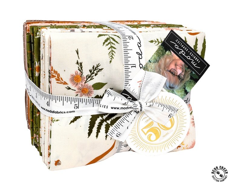 Frivolity  by Sweetfire Road for Moda is a whimsical celebration of nature’s quiet magic.  A gorgeous palette of peach, fern, marigold, and spicy red dances across a rich cream background, bringing to life lush ferns, wild dahlias, and tiny mushrooms.  Inspired by the idea of a woodland tea party, this fanciful collection invites you to sip chamomile and spot a curious critter (or two) tucked sweetly within the prints.  Frivolity  features versatile patterns drawn from the wild beauty of the forest, along with a charming set of panels perfect for pillows, quilts, and more.  Let the rich, enchanting color palette spark your creativity — and for an especially romantic pairing, mix and match with prints from my popular Evermore  collection.