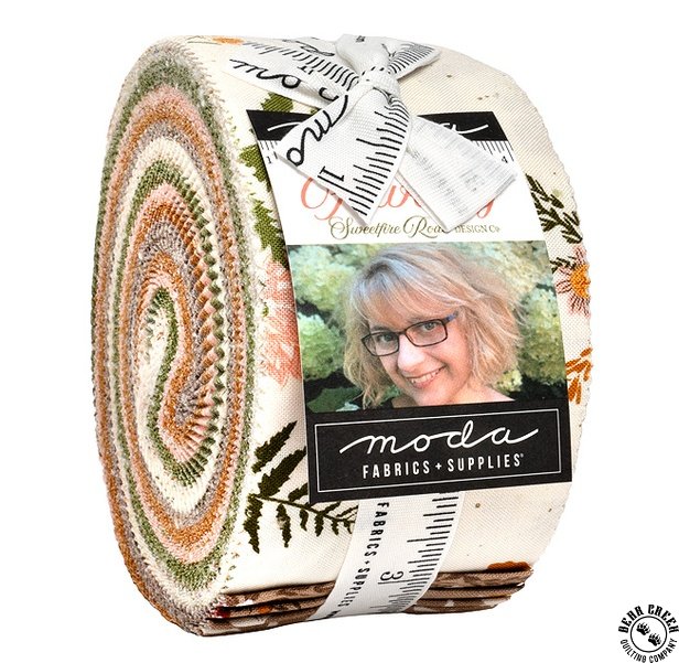 Frivolity  by Sweetfire Road for Moda is a whimsical celebration of nature’s quiet magic.  A gorgeous palette of peach, fern, marigold, and spicy red dances across a rich cream background, bringing to life lush ferns, wild dahlias, and tiny mushrooms.  Inspired by the idea of a woodland tea party, this fanciful collection invites you to sip chamomile and spot a curious critter (or two) tucked sweetly within the prints.  Frivolity  features versatile patterns drawn from the wild beauty of the forest, along with a charming set of panels perfect for pillows, quilts, and more.  Let the rich, enchanting color palette spark your creativity — and for an especially romantic pairing, mix and match with prints from my popular Evermore  collection.