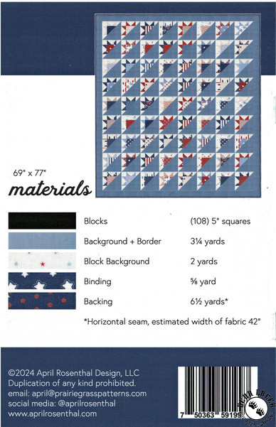 Frontier Quilt Pattern View Larger Image Price: $11.99 1 item(s) available. Item # PTN-PGP-197 Tweet Pin It Frontier Quilt PatternFeaturing the Star Spangled fabric collection by Moda. Pattern and instructions; fabric not included Finished size is 69 inches by 77 inches Designd by April Rosenthal Published by April Rosenthal Copyright 2025 Related Products Good Folks Quilt Pattern Item # PTN-PGP-198 $11.99 Pioneer Day Quilt Pattern Item # PTN-PGP-199 $11.99 Star Spangled Fat Quarter Bundle by Moda Item # 24170AB $109.99