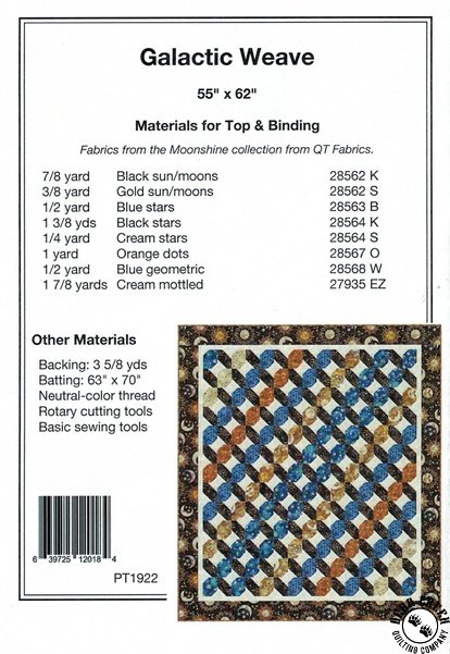 Galactic Weave Quilt Pattern View Larger Image Price: SALE $8.39 1 item(s) available. Item # PTN-1922 | Reg. $11.99 Tweet Pin It Galactic Weave Quilt PatternFeaturing the Moonshadow fabric collection by QT Fabrics. Pattern and instructions; fabric not included Finished quilt measures 55 inches by 62 inches Designed by Sue Harvey and Sandy Boobar Published by Pine Tree Country Quilts Copyright 2021