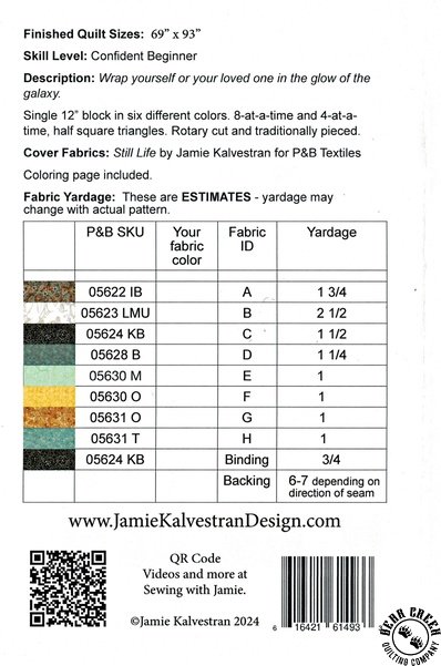 Galaxies Beyond Quilt Pattern View Larger Image Price: SALE $8.39 10 item(s) available. Item # PTN-JKD-131 | Reg. $11.99 Pin It Galaxies Beyond Quilt PatternFeaturing the Still Life fabric collection by P&B Textiles. Pattern and instructions; fabric not included Finished size is 69 inches by 93 inches Authored by and Published by Jamie Kalvestran Copyright 2024 Related Products Galaxies Beyond Quilt Pattern Item # PTN-JKD-131 | Reg. $11.99 SALE from $8.39 P&B Textiles Still Life Flower Vase Block Panel Multi Item # SLIF-5620-MU | Reg. $7.99 SALE from $4.95 Still Life Free Quilt Pattern Item # still-life-free-quilt-pattern $0.00