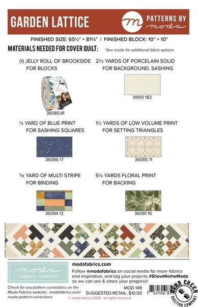 Garden Lattice Quilt Pattern View Larger Image Price: SALE $6.99 9 item(s) available. Item # PTN-MOD149 | Reg. $9.99 Pin It Garden Lattice Quilt PatternFeaturing the Brookside fabric collection by Moda. Pattern and instructions; fabric not included Finished size is 65 1/2 inches by 81 3/4 inches Designed by Susan Vaughan Published by Moda Copyright 2025 Related Products Brookside Charm Pack Item # 36080PP | Reg. $12.99 SALE from $9.09 Brookside Fat Quarter Bundle by Moda Item # 36080AB | Reg. $134.99 SALE from $94.49 Brookside Jelly Roll by Moda Item # 36080JR | Reg. $49.99 SALE from $34.99 Desert Rose Quilt Pattern Item # PTN-HQ122 | Reg. $11.99 SALE from $8.39 Moda Brookside Bramble Floral Blossom Item # 36081-12 | Reg. $12.99 SALE from $9.09 Moda Brookside Bramble Floral Lake Item # 36081-18 | Reg. $12.99 SALE from $9.09 Moda Brookside Bramble Floral Midnight Item # 36081-19 | Reg. $12.99 SALE from $9.09 Moda Brookside Bramble Floral Sagebrush Item # 36081-16 | Reg. $12.99 SALE from $9.09 Moda Brookside Breezy Blossom Item # 36086-12 | Reg. $12.99 SALE from $9.09 Moda Brookside Breezy Breeze Item # 36086-15 | Reg. $12.99 SALE from $9.09 Moda Brookside Breezy Brooke Item # 36086-17 | Reg. $12.99 SALE from $9.09 Moda Brookside Breezy Cloud Item # 36086-11 | Reg. $12.99 SALE from $9.09 Moda Brookside Breezy Lake Item # 36086-18 | Reg. $12.99 SALE from $9.09 Moda Brookside Breezy Midnight Item # 36086-19 | Reg. $12.99 SALE from $9.09 Moda Brookside Breezy Terra Cotta Item # 36086-14 | Reg. $12.99 SALE from $9.09 Moda Brookside Forage Floral Breeze Item # 36080-15 | Reg. $12.99 SALE from $9.09 Moda Brookside Forage Floral Cloud Item # 36080-11 | Reg. $12.99 SALE from $9.09 Moda Brookside Forage Floral Midnight Item # 36080-19 | Reg. $12.99 SALE from $9.09 Moda Brookside Forage Floral Terra Cotta Item # 36080-14 | Reg. $12.99 SALE from $9.09 Moda Brookside Montauk Breeze Item # 36082-15 | Reg. $12.99 SALE from $9.09 Moda Brookside Montauk Lake Item # 36082-18 | Reg. $12.99 SALE from $9.09 Moda Brookside Montauk Midnight Item # 36082-19 | Reg. $12.99 SALE from $9.09 Moda Brookside Sun River Lake Item # 36083-18 | Reg. $12.99 SALE from $9.09 Moda Brookside Sun River Sagebrush Item # 36083-16 | Reg. $12.99 SALE from $9.09 Moda Brookside Sun River Terra Cotta Item # 36083-14 | Reg. $12.99 SALE from $9.09 Moda Brookside Sun River Yarrow Item # 36083-13 | Reg. $12.99 SALE from $9.09