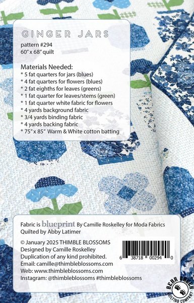 Ginger Jars Quilt Pattern View Larger Image Price: $11.99 5 item(s) available. Item # PTN-294 Pin It Ginger Jars Quilt PatternFeaturing the Blueprint fabric collection by Moda. Pattern and instructions; fabric not included Finished size is 60 inches by 68 inches Designed by Camille Roskelley Published by Thimble Blossoms Copyright 2025 Related Products Bluebird Quilt Pattern Item # PTN-295 $11.99 Blueprint Charm Pack by Moda Item # 55330PP $12.99 Blueprint Fat Quarter Bundle by Moda Item # 55330AB $179.99 Blueprint Jelly Roll by Moda Item # 55330JR $49.99 Blueprint Layer Cake by Moda Item # 55330LC $49.99 Home Quilt Pattern Item # PTN-296 $11.99 Moda Blueprint Bloomsbury Navy Item # 55333-16 $12.99 Moda Blueprint Bloomsbury White/Multi Item # 55333-11 $12.99 Moda Blueprint Grace Navy Item # 55331-16 $12.99 Moda Blueprint Grace Navy Tonal Item # 55331-36 $12.99 Moda Blueprint Grace Sea Item # 55331-17 $12.99 Moda Blueprint Grace White/Harbor Item # 55331-11 $12.99 Moda Blueprint Grace White/Navy Item # 55331-26 $12.99 Moda Blueprint Heirloom White/Navy Item # 55330-26 $12.99 Moda Blueprint Starlight Navy Item # 55337-16 $12.99 Moda Blueprint Starlight White/Blue Item # 55337-11 $12.99 Moda Blueprint Vineyard Navy Item # 55338-16 $12.99 Moda Blueprint Vineyard Sea Item # 55338-17 $12.99 Moda Blueprint Vineyard White/Multi Item # 55338-11 $12.99 Something Blue Quilt Pattern Item # PTN-297 $11.99