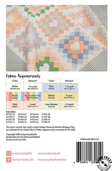 Granny's Heart Quilt Pattern View Larger Image Price: SALE $10.49 1 item(s) available. Item # PTN-MSQL-165 | Reg. $14.99 Tweet Pin It Granny's Heart Quilt PatternFeaturing the Cottage Charm fabric collection by Moda. Pattern and instructions; fabric not included Finished size is 73 inches by 73 inches Authored by Heather Briggs Published by My Sew Quilting Life Copyright 2025 Related Products Blooming Stitches Quilt Pattern Item # PTN-MSQL-160 | Reg. $14.99 SALE from $10.49