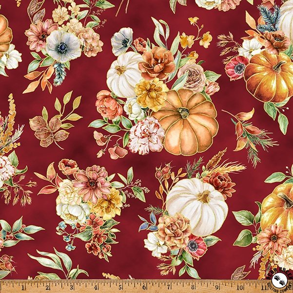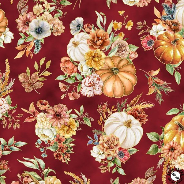 Hoffman Fabrics Harvest Bouquet Pumpkins and Flowers Maroon