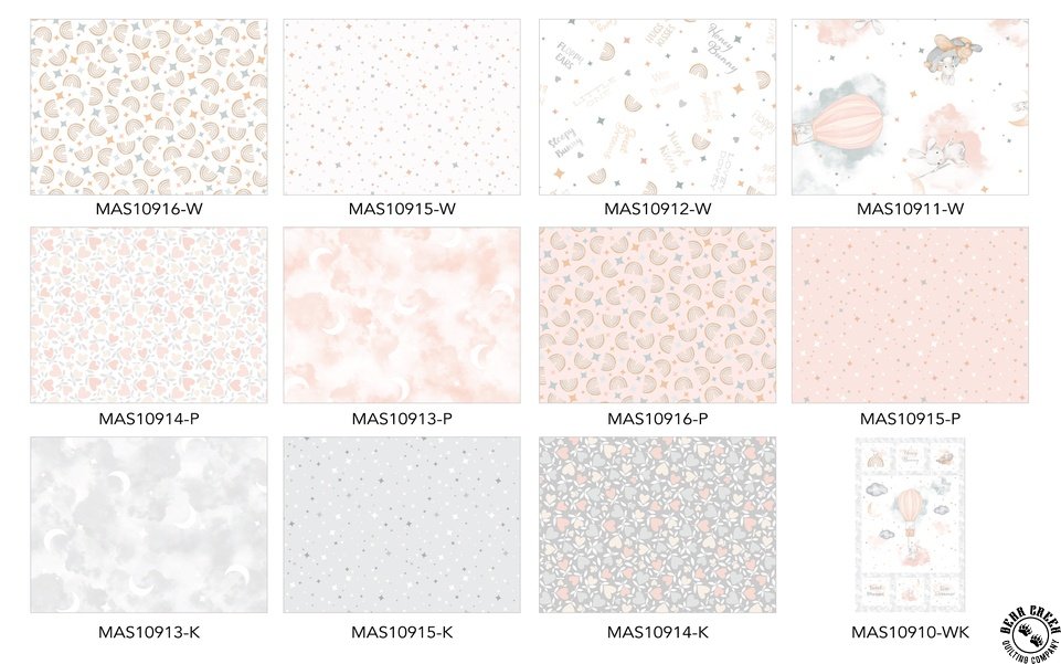 Honey Bunny offers a soothing palette designed for all the wee dreamers, with gentle greys, soft peaches, and delicate whites. Playful scenes of rainbows and hot air balloons capture the magic of childhood adventures, while floppy ears and fluffy clouds add a whimsical charm. Perfect for stitching sweet nursery quilts and heartfelt baby gifts, Honey Bunny invites you to create cozy, handmade treasures for the littlest ones in your life.