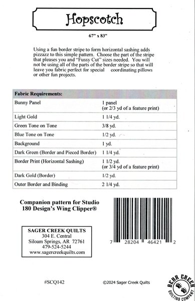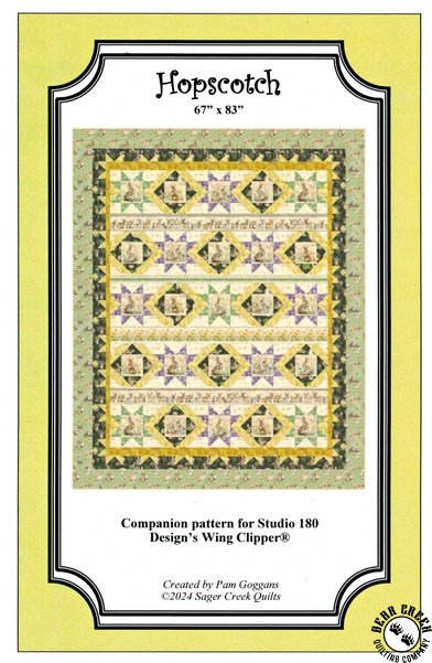 Hopscotch Quilt Pattern View Larger Image Price: SALE $8.39 4 item(s) available. Item # PTN-SCQ142 | Reg. $11.99 Tweet Pin It Hopscotch Quilt PatternFeaturing the Hunny Bunny fabric collection by QT Fabrics. Pattern and instructions; fabric not included Finished size is 67 inches by 83 inches Authored by Pam Goggans Published by Sager Creek Quilts Copyright 2025