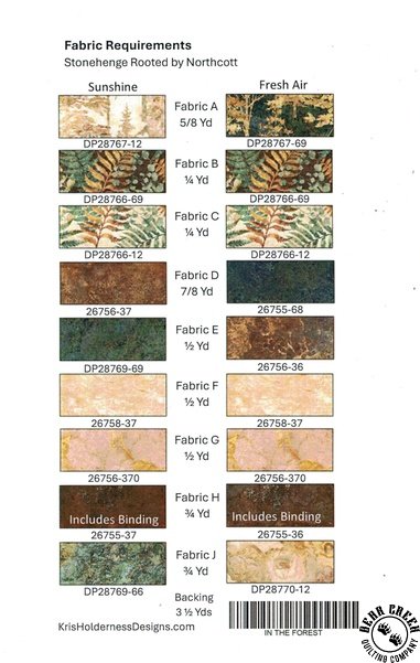 In The Forest Quilt Pattern View Larger Image Price: $13.99 11 item(s) available. Item # PTN-3583 Pin It In The Forest Quilt PatternFeaturing the Stonehenge Rooted fabric collection by Northcott. Pattern and instructions; fabric not included Finished size is 50 inches by 62 inches Designed by Kris Holden Published by Kris Holden Designs Copyright 2026 Related Products Dig Deep Quilt Pattern Item # PTN-3582 $13.99 Northcott Stonehenge Rooted 108 Inch Wide Backing Fabric Agate Beige Item # BACKING-B28770-12 $24.99 Northcott Stonehenge Rooted Agate Beige Item # DP28770-12 $13.99 Northcott Stonehenge Rooted Agate Rust Item # DP28770-37 $13.99 Northcott Stonehenge Rooted Leaves Beige/Multi Item # DP28766-12 $13.99 Northcott Stonehenge Rooted Leaves Teal/Multi Item # DP28766-69 $13.99 Northcott Stonehenge Rooted Marble Dark Teal Item # DP28769-69 $13.99 Northcott Stonehenge Rooted Marble Light Teal Item # DP28769-66 $13.99 Northcott Stonehenge Rooted Panel Item # DP28765-69 $9.99 Northcott Stonehenge Rooted Pebbles Rust Item # DP28768-37 $13.99 Northcott Stonehenge Rooted Pebbles Teal Item # DP28768-69 $13.99 Northcott Stonehenge Rooted Trees Beige/Multi Item # DP28767-12 $13.99 Northcott Stonehenge Rooted Trees Teal/Multi Item # DP28767-69 $13.99