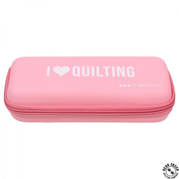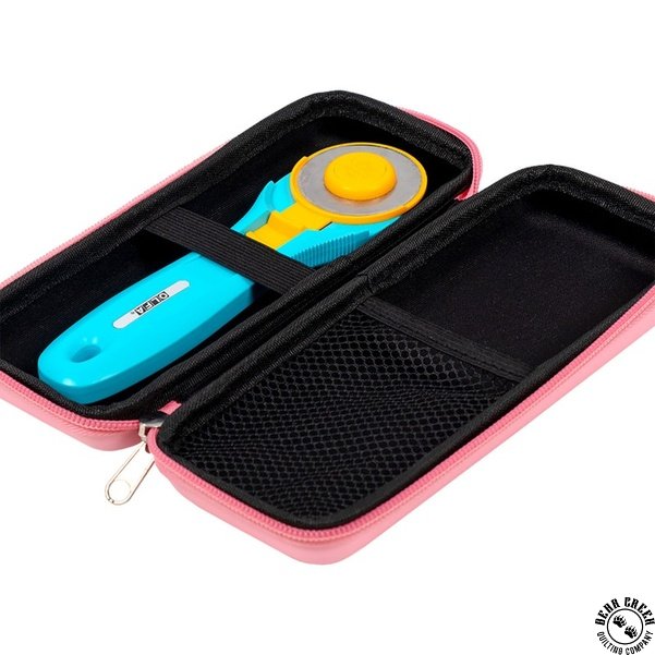 Sporting happy graphics any quilter can stand behind, it is fun and functional. Safely store your rotary cutters inside the elastic mesh band, while replacement blades, thread spools, seam rippers and small scissors can be tucked into the elastic mesh pocket. A sturdy zipper contains everything in a rigid, yet light case.