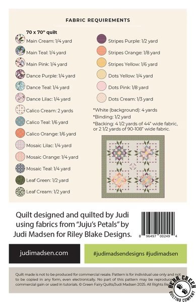 Juju's Petals Quilt Pattern View Larger Image Price: SALE $9.59 12 item(s) available. Item # PTN-No.123 | Reg. $11.99 Tweet Pin It Juju's Petals Quilt PatternFeaturing the Juju's Petals fabric collection Riley Blake Designs. Pattern and instructions; fabric not included Finished size is 70 inches by 70 inches Designed by Judi Madsen Published by Judi Madsen Designs Copyright 2025 Related Products Bohemian Quilt Pattern Item # PTN-No.101 | Reg. $11.99 SALE from $9.59 Butterfly Dance Quilt Pattern Item # PTN-No.122 | Reg. $11.99 SALE from $9.59 Butterfly Kisses Quilt Pattern Item # PTN-No.125 | Reg. $11.99 SALE from $9.59 Juju's Petals 10" Squares by Riley Blake Designs Item # 10-16610-42 | Reg. $49.99 SALE from $39.99 Juju's Petals Fat Quarter Bundle by Riley Blake Designs Item # FQ-16610-21 | Reg. $79.99 SALE from $63.99 Juju's Petals Strip Roll by Riley Blake Designs Item # RP-16610-40 | Reg. $49.99 SALE from $39.99 Juju's Tiles Quilt Pattern Item # PTN-No.121 | Reg. $11.99 SALE from $9.59 Mama Juju Quilt Pattern Item # PTN-No.124 | Reg. $11.99 SALE from $9.59 Riley Blake Designs Juju's Petals Calico Cream Item # C16613-CREAM | Reg. $11.99 SALE from $9.59 Riley Blake Designs Juju's Petals Calico Orange Item # C16613-ORANGE | Reg. $11.99 SALE from $9.59 Riley Blake Designs Juju's Petals Calico Teal Item # C16613-TEAL | Reg. $11.99 SALE from $9.59 Riley Blake Designs Juju's Petals Dance Lilac Item # C16611-LILAC | Reg. $11.99 SALE from $9.59 Riley Blake Designs Juju's Petals Dance Purple Item # C16611-PURPLE | Reg. $11.99 SALE from $9.59 Riley Blake Designs Juju's Petals Dance Teal Item # C16611-TEAL | Reg. $11.99 SALE from $9.59 Riley Blake Designs Juju's Petals Dots Cream Item # C16616-CREAM | Reg. $11.99 SALE from $9.59 Riley Blake Designs Juju's Petals Dots Green Item # C16616-GREEN | Reg. $11.99 SALE from $9.59 Riley Blake Designs Juju's Petals Dots Pink Item # C16616-PINK | Reg. $11.99 SALE from $9.59 Riley Blake Designs Juju's Petals Dots Yellow Item # C16616-YELLOW | Reg. $11.99 SALE from $9.59 Riley Blake Designs Juju's Petals Leaves Cream Item # C16612-CREAM | Reg. $11.99 SALE from $9.59 Riley Blake Designs Juju's Petals Leaves Green Item # C16612-GREEN | Reg. $11.99 SALE from $9.59 Riley Blake Designs Juju's Petals Main Pink Item # C16610-PINK | Reg. $11.99 SALE from $9.59 Riley Blake Designs Juju's Petals Main Teal Item # C16610-TEAL | Reg. $11.99 SALE from $9.59 Riley Blake Designs Juju's Petals Mosaic Lilac Item # C16614-LILAC | Reg. $11.99 SALE from $9.59 Riley Blake Designs Juju's Petals Mosaic Orange Item # C16614-ORANGE | Reg. $11.99 SALE from $9.59 Riley Blake Designs Juju's Petals Mosaic Teal Item # C16614-TEAL | Reg. $11.99 SALE from $9.59 Riley Blake Designs Juju's Petals Stripes Orange Item # C16615-ORANGE | Reg. $11.99 SALE from $9.59 Riley Blake Designs Juju's Petals Stripes Purple Item # C16615-PURPLE | Reg. $11.99 SALE from $9.59 Riley Blake Designs Juju's Petals Stripes Yellow Item # C16615-YELLOW | Reg. $11.99 SALE from $9.59