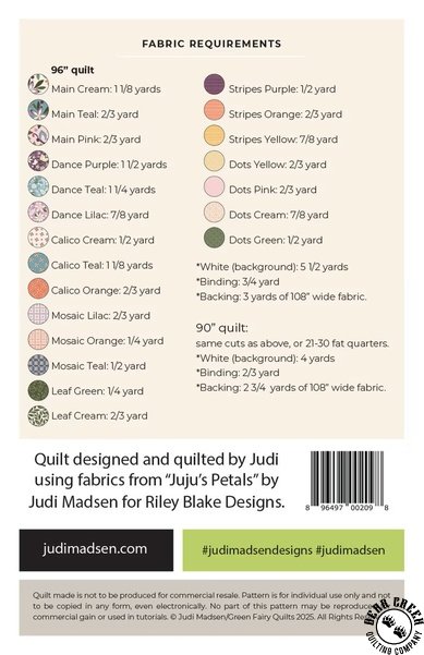 Juju's Tiles Quilt Pattern View Larger Image Price: SALE $9.59 11 item(s) available. Item # PTN-No.121 | Reg. $11.99 Tweet Pin It Juju's Tiles Quilt PatternFeaturing the Juju's Petals fabric collection Riley Blake Designs. Pattern and instructions; fabric not included Finished size: 90 inches by 90 inches 96 inches by 96 inches Designed by Judi Madsen Published by Judi Madsen Designs Copyright 2025 Related Products Bohemian Quilt Pattern Item # PTN-No.101 | Reg. $11.99 SALE from $9.59 Butterfly Dance Quilt Pattern Item # PTN-No.122 | Reg. $11.99 SALE from $9.59 Butterfly Kisses Quilt Pattern Item # PTN-No.125 | Reg. $11.99 SALE from $9.59 Juju's Petals 10" Squares by Riley Blake Designs Item # 10-16610-42 | Reg. $49.99 SALE from $39.99 Juju's Petals Fat Quarter Bundle by Riley Blake Designs Item # FQ-16610-21 | Reg. $79.99 SALE from $63.99 Juju's Petals Quilt Pattern Item # PTN-No.123 | Reg. $11.99 SALE from $9.59 Juju's Petals Strip Roll by Riley Blake Designs Item # RP-16610-40 | Reg. $49.99 SALE from $39.99 Mama Juju Quilt Pattern Item # PTN-No.124 | Reg. $11.99 SALE from $9.59 Riley Blake Designs Juju's Petals Calico Cream Item # C16613-CREAM | Reg. $11.99 SALE from $9.59 Riley Blake Designs Juju's Petals Calico Orange Item # C16613-ORANGE | Reg. $11.99 SALE from $9.59 Riley Blake Designs Juju's Petals Calico Teal Item # C16613-TEAL | Reg. $11.99 SALE from $9.59 Riley Blake Designs Juju's Petals Dance Lilac Item # C16611-LILAC | Reg. $11.99 SALE from $9.59 Riley Blake Designs Juju's Petals Dance Purple Item # C16611-PURPLE | Reg. $11.99 SALE from $9.59 Riley Blake Designs Juju's Petals Dance Teal Item # C16611-TEAL | Reg. $11.99 SALE from $9.59 Riley Blake Designs Juju's Petals Dots Cream Item # C16616-CREAM | Reg. $11.99 SALE from $9.59 Riley Blake Designs Juju's Petals Dots Green Item # C16616-GREEN | Reg. $11.99 SALE from $9.59 Riley Blake Designs Juju's Petals Dots Pink Item # C16616-PINK | Reg. $11.99 SALE from $9.59 Riley Blake Designs Juju's Petals Dots Yellow Item # C16616-YELLOW | Reg. $11.99 SALE from $9.59 Riley Blake Designs Juju's Petals Leaves Cream Item # C16612-CREAM | Reg. $11.99 SALE from $9.59 Riley Blake Designs Juju's Petals Leaves Green Item # C16612-GREEN | Reg. $11.99 SALE from $9.59 Riley Blake Designs Juju's Petals Main Pink Item # C16610-PINK | Reg. $11.99 SALE from $9.59 Riley Blake Designs Juju's Petals Main Teal Item # C16610-TEAL | Reg. $11.99 SALE from $9.59 Riley Blake Designs Juju's Petals Mosaic Lilac Item # C16614-LILAC | Reg. $11.99 SALE from $9.59 Riley Blake Designs Juju's Petals Mosaic Orange Item # C16614-ORANGE | Reg. $11.99 SALE from $9.59 Riley Blake Designs Juju's Petals Mosaic Teal Item # C16614-TEAL | Reg. $11.99 SALE from $9.59 Riley Blake Designs Juju's Petals Stripes Orange Item # C16615-ORANGE | Reg. $11.99 SALE from $9.59 Riley Blake Designs Juju's Petals Stripes Purple Item # C16615-PURPLE | Reg. $11.99 SALE from $9.59 Riley Blake Designs Juju's Petals Stripes Yellow Item # C16615-YELLOW | Reg. $11.99 SALE from $9.59