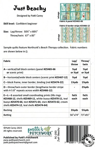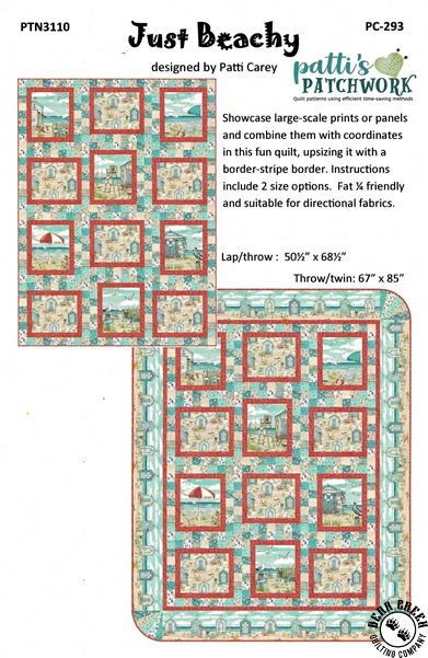 Just Beachy Quilt Pattern View Larger Image Price: SALE $10.49 3 item(s) available. Item # PTN-3110 | Reg. $14.99 Pin It Just Beachy Quilt PatternFeaturing the Beach Therapy fabric collection by Northcott. Pattern and instructions; fabric not included Finished quilt measures: Lap/Throw = 50 1/2 inches by 68 1/2 inches Throw/Twin = 67 inches by 85 inches Designed by Patti Carey Published by Patti's Patchwork Copyright 2023