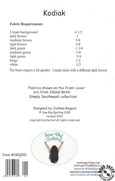 Kodiak Quilt Pattern View Larger Image Price: SALE $10.49 3 item(s) available. Item # PTN-SBQ001 | Reg. $14.99 Tweet Pin It Kodiak Quilt Pattern Pattern and instructions; fabric not included Finished quilt measures 92 inches by 92 inches Designed JoAnna Rogers Published by Sew Big Quilting Copyright 2019