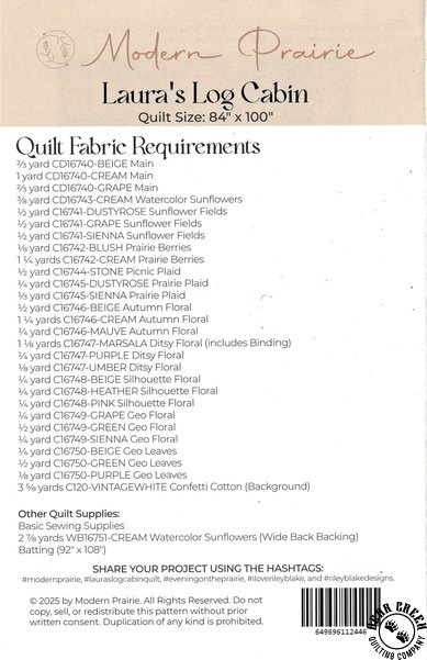 Laura's Log Cabin Quilt Pattern View Larger Image Price: SALE $11.99 8 item(s) available. Item # PTN-649696112446 | Reg. $14.99 Tweet Pin It Laura's Log Cabin Quilt PatternFeaturing the Evening on the Prairie fabric collection by Riley Blake Designs. Pattern and instructions; fabric not included Finished size is 84 inches by 100 inches Designed by Melissa Gilbert Published by Modern Prairie Copyright 2025 Related Products Evening on the Prairie 10" Squares by Riley Blake Designs Item # 10-16740-42 | Reg. $49.99 SALE from $39.99 Evening on the Prairie 5" Squares by Riley Blake Designs Item # 5-16740-42 | Reg. $14.99 SALE from $11.99 Evening on the Prairie Fat Quarter Bundle by Riley Blake Designs Item # FQ-16740-27 | Reg. $89.99 SALE from $71.99 Evening on the Prairie Free Quilt Pattern Item # evening-on-the-prairie-free-quilt-pattern $0.00 Evening on the Prairie Strip Roll by Riley Blake Designs Item # RP-16740-40 | Reg. $49.99 SALE from $39.99 Prairie Garden Quilt Pattern Item # PTN-649696400659 | Reg. $14.99 SALE from $11.99 Prairie Leaves Quilt Pattern Item # PTN-649696462923 | Reg. $14.99 SALE from $11.99 Riley Blake Designs Evening on the Prairie Tote Panel Grape Item # HD16755-GRAPE | Reg. $18.99 SALE from $15.19 Riley Blake Designs Evening on the Prairie Tote Panel Sienna Item # HD16755-SIENNA | Reg. $18.99 SALE from $15.19 Riley Blake Evening on the Prairie Autumn Floral Beige Item # CD16746-BEIGE | Reg. $11.99 SALE from $9.59 Riley Blake Evening on the Prairie Autumn Floral Cream Item # CD16746-CREAM | Reg. $11.99 SALE from $9.59 Riley Blake Evening on the Prairie Autumn Floral Mauve Item # CD16746-MAUVE | Reg. $11.99 SALE from $9.59 Riley Blake Evening on the Prairie Berries Blush Item # CD16742-BLUSH | Reg. $11.99 SALE from $9.59 Riley Blake Evening on the Prairie Berries Cream Item # CD16742-CREAM | Reg. $11.99 SALE from $9.59 Riley Blake Evening on the Prairie Ditsy Floral Marsala Item # CD16747-MARSALA | Reg. $11.99 SALE from $9.59 Riley Blake Evening on the Prairie Ditsy Floral Purple Item # CD16747-PURPLE | Reg. $11.99 SALE from $9.59 Riley Blake Evening on the Prairie Ditsy Floral Umber Item # CD16747-UMBER | Reg. $11.99 SALE from $9.59 Riley Blake Evening on the Prairie Geo Floral Grape Item # CD16749-GRAPE | Reg. $11.99 SALE from $9.59 Riley Blake Evening on the Prairie Geo Floral Green Item # CD16749-GREEN | Reg. $11.99 SALE from $9.59 Riley Blake Evening on the Prairie Geo Floral Sienna Item # CD16749-SIENNA | Reg. $11.99 SALE from $9.59 Riley Blake Evening on the Prairie Geo Leaves Beige Item # CD16750-BEIGE | Reg. $11.99 SALE from $9.59 Riley Blake Evening on the Prairie Geo Leaves Green Item # CD16750-GREEN | Reg. $11.99 SALE from $9.59 Riley Blake Evening on the Prairie Geo Leaves Purple Item # CD16750-PURPLE | Reg. $11.99 SALE from $9.59 Riley Blake Evening on the Prairie Main Beige Item # CD16740-BEIGE | Reg. $11.99 SALE from $9.59 Riley Blake Evening on the Prairie Main Cream Item # CD16740-CREAM | Reg. $11.99 SALE from $9.59 Riley Blake Evening on the Prairie Main Grape Item # CD16740-GRAPE | Reg. $11.99 SALE from $9.59 Riley Blake Evening on the Prairie Picnic Plaid Stone Item # CD16744-STONE | Reg. $11.99 SALE from $9.59 Riley Blake Evening on the Prairie Plaid Dusty Rose Item # CD16745-DUSTYROSE | Reg. $11.99 SALE from $9.59 Riley Blake Evening on the Prairie Plaid Sienna Item # CD16745-SIENNA | Reg. $11.99 SALE from $9.59 Riley Blake Evening on the Prairie Silhouette Floral Beige Item # CD16748-BEIGE | Reg. $11.99 SALE from $9.59 Riley Blake Evening on the Prairie Silhouette Floral Heather Item # CD16748-HEATHER | Reg. $11.99 SALE from $9.59 Riley Blake Evening on the Prairie Silhouette Floral Pink Item # CD16748-PINK | Reg. $11.99 SALE from $9.59 Riley Blake Evening on the Prairie Sunflower Dusty Rose Item # CD16741-DUSTYROSE | Reg. $11.99 SALE from $9.59 Riley Blake Evening on the Prairie Sunflower Grape Item # CD16741-GRAPE | Reg. $11.99 SALE from $9.59 Riley Blake Evening on the Prairie Sunflower Sienna Item # CD16741-SIENNA | Reg. $11.99 SALE from $9.59 Riley Blake Evening on the Prairie Sunflowers Cream Item # CD16753-CREAM | Reg. $11.99 SALE from $9.59