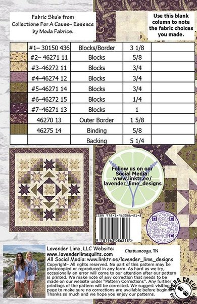 Lavender Breeze Quilt Pattern View Larger Image Price: $13.99 7 item(s) available. Item # PTN-DLL253 Pin It Lavender Breeze Quilt PatternFeaturing the Collections for a Cause Essence fabric collection by Moda. Pattern and instructions; fabric not included Finished size is 76 1/2 inches by 80 1/2 inches Designed by Kathy Skomp and Bekah Pipes Published by Designs by LavenderLime Copyright 2025 Related Products Apricot Jelly Quilt Pattern Item # PTN-MOD145 $9.99 Collection for a Cause Essence Charm Pack by Moda Item # 46270PP $12.99 Collection for a Cause Essence Fat Quarter Bundle by Moda Item # 46270AB $159.99 Collection for a Cause Essence Jelly Roll by Moda Item # 46270JR $49.99 Collection for a Cause Essence Layer Cake by Moda Item # 46270LC $49.99 Dream Weaving Quilt Pattern Item # PTN-ES-402-DRW $11.99 Moda Collections for a Cause Essence Blossoms Clover Item # 46274-14 $12.99 Moda Collections for a Cause Essence Blossoms Lavender Item # 46274-12 $12.99 Moda Collections for a Cause Essence Blossoms Parchment Item # 46274-11 $12.99 Moda Collections for a Cause Essence English Ivy Parchment Item # 46273-11 $12.99 Moda Collections for a Cause Essence English Ivy Plum Item # 46273-13 $12.99 Moda Collections for a Cause Essence English Ivy Soil Item # 46273-15 $12.99 Moda Collections for a Cause Essence Floral Paisley Lavender Item # 46270-12 $12.99 Moda Collections for a Cause Essence Floral Paisley Parchment Item # 46270-11 $12.99 Moda Collections for a Cause Essence Floral Paisley Plum Item # 46270-13 $12.99 Moda Collections for a Cause Essence Floral Stripe Clover Item # 46275-14 $12.99 Moda Collections for a Cause Essence Floral Stripe Lavender Item # 46275-12 $12.99 Moda Collections for a Cause Essence Floral Stripe Parchment Item # 46275-11 $12.99 Moda Collections for a Cause Essence Little Plaid Parchment Item # 46277-11 $12.99 Moda Collections for a Cause Essence Little Plaid Plum Item # 46277-13 $12.99 Moda Collections for a Cause Essence Little Plaid Soil Item # 46277-15 $12.99 Moda Collections for a Cause Essence Little Vine Parchment Item # 46276-11 $12.99 Moda Collections for a Cause Essence Little Vine Plum Item # 46276-13 $12.99 Moda Collections for a Cause Essence Little Vine Soil Item # 46276-15 $12.99 Moda Collections for a Cause Essence Meandering Path Lavender Item # 46272-12 $12.99 Moda Collections for a Cause Essence Meandering Path Parchment Item # 46272-11 $12.99 Moda Collections for a Cause Essence Meandering Path Soil Item # 46272-15 $12.99 Moda Collections for a Cause Essence Plums Clover Item # 46271-14 $12.99 Moda Collections for a Cause Essence Plums Parchment Item # 46271-11 $12.99 Moda Collections for a Cause Essence Plums Plum Item # 46271-13 $12.99 Moda Collections for a Cause Essence Shaded Solid Clover Item # 46279-14 $12.99 Moda Collections for a Cause Essence Shaded Solid Lavender Item # 46279-12 $12.99 Moda Collections for a Cause Essence Shaded Solid Parchment Item # 46279-11 $12.99 Moda Collections for a Cause Essence Shaded Solid Plum Item # 46279-13 $12.99 Moda Collections for a Cause Essence Shaded Solid Soil Item # 46279-15 $12.99 Moda Collections for a Cause Essence Trailing Vines Clover Item # 46278-14 $12.99 Moda Collections for a Cause Essence Trailing Vines Parchment Item # 46278-11 $12.99 Moda Collections for a Cause Essence Trailing Vines Plum Item # 46278-13 $12.99