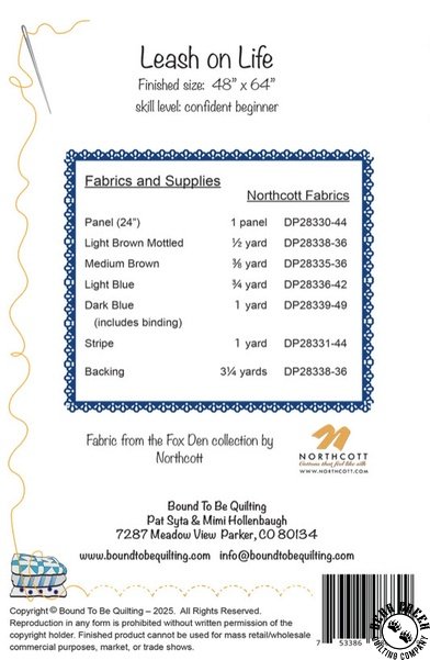 Leash on Life Quilt Pattern View Larger Image Price: $13.99 7 item(s) available. Item # PTN-3524/BTBQ523 Tweet Pin It Leash on Life Quilt PatternFeaturing the Fox Den fabric collection by Northcott. Pattern and instructions; fabric not included Finished size is 48 inches by 64 inches Designed by Pat Syta and Mimi Hollenbaugh Published by Bound to be Quilting Copyright 2025 Related Products First Light Quilt Pattern Item # PTN-3523 $11.99 Northcott Fox Den Fox Dense Blue/Multi Item # DP28332-44 $12.99 Northcott Fox Den Fox Open Beige/Multi Item # DP28333-14 $12.99 Northcott Fox Den Multi Texture Blue Item # DP28338-44 $12.99 Northcott Fox Den Multi Texture Rust Item # DP28338-36 $12.99 Northcott Fox Den Ombre Blue/Multi Item # DP28331-44 $12.99 Northcott Fox Den Panel Item # DP28330-44 $8.99 Northcott Fox Den Pine Needle Beige Item # DP28337-14 $12.99 Northcott Fox Den Plaid Beige/Multi Item # DP28334-14 $12.99 Northcott Fox Den Smooth Texture Dark Blue Item # DP28339-49 $12.99 Northcott Fox Den Stone Texture Light Blue Item # DP28336-42 $12.99 Northcott Fox Den Trees Dark Rust Item # DP28335-36 $12.99