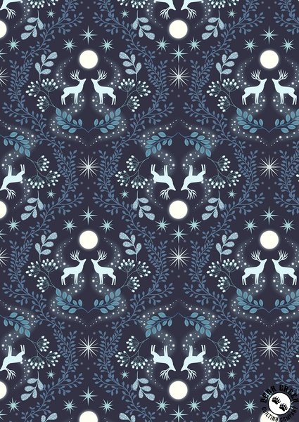 Step into a frozen wonderland with A Winter’s Moon,  a magical collection from Lewis and Irene Fabrics.  Inspired by the ethereal glow of the moon on a crisp winter night, each design is enhanced with pearlescent accents that capture the sparkle of the season.  Frosted foliage, twinkling stars, and delicate pearl snowdrops shimmer with wintry charm, while majestic stags and curious hares bask in the moonlight beneath a glowing pearl sky.  Perfect for bringing the enchantment of winter into your sewing projects, this collection includes a stunning double-edge border and a large panel of seasonal squares—ideal for quilts, cushions, bags, or wherever your creativity leads.
