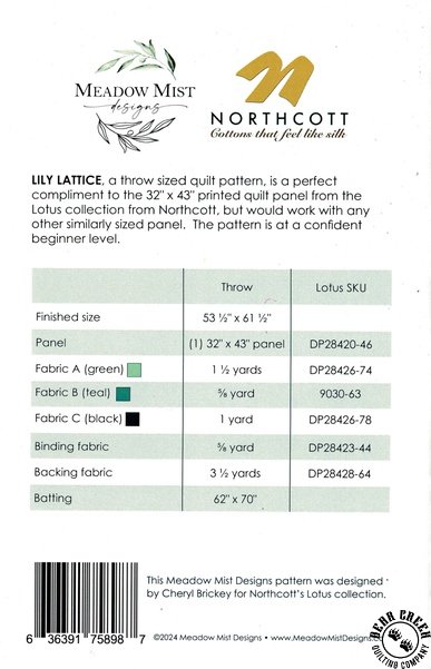 Lily Lattice Quilt Pattern View Larger Image Price: SALE $3.50 5 item(s) available. Item # PTN-3538 | Reg. $13.99 Pin It Lily Lattice Quilt PatternFeaturing the Lotus fabric collection by Northcott. Pattern and instructions; fabric not included Finished size is 53 1/2 inches by 61 1/2 inches Designed by Cheryl Brickey Published by Meadow Mist Designs Copyright 2025 Related Products Lotus Quilt Pattern Item # PTN-3539/CMD324 | Reg. $11.99 SALE from $3.00