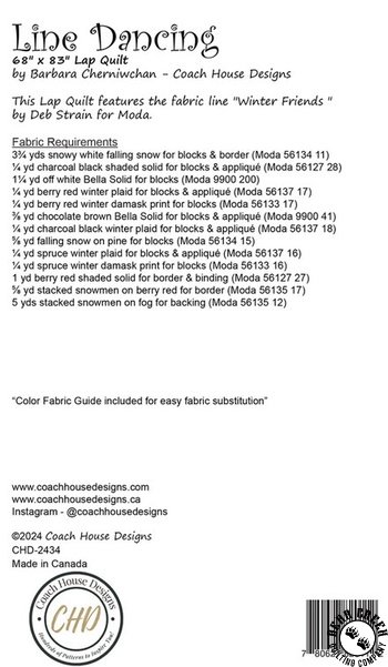 Line Dancing Quilt Pattern View Larger Image Price: $11.99 3 item(s) available. Item # PTN-CHD-2434 Tweet Pin It Line Dancing Quilt PatternFeaturing the Winter Friends fabric collection by Moda. Pattern and instructions; fabric not included Finished size is 68 inches by 83 inches Designed by Barb Cherniwchan Published by Coach House Designs Copyright 2025 Related Products Among Friends Quilt Pattern Item # PTN-CHD-2433 $11.99 Moda Winter Friends 108 Inch Wide Backing Fabric Falling Snow Berry Red Item # BACKING-108030-17 | Reg. $21.99 SALE from $16.49 Moda Winter Friends 108 Inch Wide Backing Fabric Falling Snow Charcoal Black Item # BACKING-108030-18 | Reg. $21.99 SALE from $16.49 Moda Winter Friends 108 Inch Wide Backing Fabric Falling Snow Snowy White Item # BACKING-108030-11 | Reg. $21.99 SALE from $16.49 Moda Winter Friends Cardinals in the Tree Charcoal Black Item # 56132-18 $12.49 Moda Winter Friends Cardinals in the Tree Snowy White Item # 56132-11 $12.49 Moda Winter Friends Cardinals in the Tree Spruce Item # 56132-16 $12.49 Moda Winter Friends Falling Snow Charcoal Black Item # 56134-18 $12.49 Moda Winter Friends Falling Snow Fog Item # 56134-12 $12.49 Moda Winter Friends Falling Snow Pine Item # 56134-15 $12.49 Moda Winter Friends Panel Charcoal Black Item # 56139-18 $8.99 Moda Winter Friends Shaded Solid Berry Red Item # 56127-27 $12.49 Moda Winter Friends Shaded Solid Charcoal Black Item # 56127-28 $12.49 Moda Winter Friends Shaded Solid Snowy White Item # 56127-21 $12.49 Moda Winter Friends Shaded Solid Spruce Item # 56127-26 $12.49 Moda Winter Friends Snowman and Cardinal Allover Charcoal Black Item # 56130-18 $12.49 Moda Winter Friends Snowman and Cardinal Allover Fog Item # 56130-12 $12.49 Moda Winter Friends Stacked Snowmen Berry Red Item # 56135-17 $12.49 Moda Winter Friends Stacked Snowmen Charcoal Black Item # 56135-18 $12.49 Moda Winter Friends Stacked Snowmen Fog Item # 56135-12 $12.49 Moda Winter Friends Tossed Trees Charcoal Black Item # 56136-18 $12.49 Moda Winter Friends Tossed Trees Holly Item # 56136-14 $12.49 Moda Winter Friends Tossed Trees Snowy White Item # 56136-11 $12.49 Moda Winter Friends Winter Damask Berry Red Item # 56133-17 $12.49 Moda Winter Friends Winter Damask Snowy White Item # 56133-11 $12.49 Moda Winter Friends Winter Damask Spruce Item # 56133-16 $12.49 Moda Winter Friends Winter Plaid Berry Red Item # 56137-17 $12.49 Moda Winter Friends Winter Plaid Charcoal Black Item # 56137-18 $12.49 Moda Winter Friends Winter Plaid Spruce Item # 56137-16 $12.49 Moda Winter Friends Woodland Greenery Charcoal Black Item # 56131-18 $12.49 Moda Winter Friends Woodland Greenery Holly Item # 56131-14 $12.49 Moda Winter Friends Woodland Greenery Snowy White Item # 56131-11 $12.49 Winter Friends Fat Quarter Bundle by Moda Item # 56130AB $139.99 Winter Friends Jelly Roll by Moda Item # 56130JR $44.99 Winter Stars Quilt Pattern Item # PTN-CHD-2435 $11.99