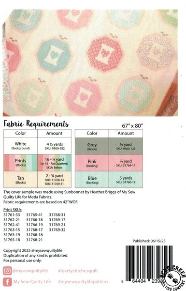 Lovely Stitches Quilt Pattern View Larger Image Price: SALE $11.99 12 item(s) available. Item # PTN-MSQL-181 | Reg. $14.99 Tweet Pin It Lovely Stitches Quilt PatternFeaturing the Sunbonnet fabric collection by Moda. Pattern and instructions; fabric not included Finished size is 67 inches by 80 inches Designed by Heather Briggs Published by My Sew Quilty Life Copyright 2025 Related Products Moda Sunbonnet Blooming Stitches Porcelain Item # 31764-11 | Reg. $12.99 SALE from $10.39 Moda Sunbonnet Embroidered Blooms Pale Blue Item # 31761-19 | Reg. $12.99 SALE from $10.39 Moda Sunbonnet Embroidered Blooms Pink Item # 31761-15 | Reg. $12.99 SALE from $10.39 Moda Sunbonnet Flower Dots Almond Item # 31762-12 | Reg. $12.99 SALE from $10.39 Moda Sunbonnet Flower Dots Coral Item # 31762-41 | Reg. $12.99 SALE from $10.39 Moda Sunbonnet Flower Dots Dusty Blue Item # 31762-21 | Reg. $12.99 SALE from $10.39 Moda Sunbonnet Lattice Almond Item # 31768-13 | Reg. $12.99 SALE from $10.39 Moda Sunbonnet Lattice Porcelain/White Item # 31768-51 | Reg. $12.99 SALE from $10.39 Moda Sunbonnet Panel Porcelain Item # 31770-11 | Reg. $12.99 SALE from $10.39 Moda Sunbonnet Pretty Petals Pale Blue Item # 31760-19 | Reg. $12.99 SALE from $10.39 Moda Sunbonnet Pretty Petals Pink Item # 31760-15 | Reg. $12.99 SALE from $10.39 Moda Sunbonnet Pretty Petals Porcelain Item # 31760-11 | Reg. $12.99 SALE from $10.39 Moda Sunbonnet Tossed Petals Pale Blue Item # 31763-19 | Reg. $12.99 SALE from $10.39 Moda Sunbonnet Tossed Petals Pink Item # 31763-15 | Reg. $12.99 SALE from $10.39 Moda Sunbonnet Tossed Petals Porcelain Item # 31763-11 | Reg. $12.99 SALE from $10.39 Moda Sunbonnet Wild Blooms Pale Blue Item # 31766-19 | Reg. $12.99 SALE from $10.39 Moda Sunbonnet Wild Blooms Pear Item # 31766-18 | Reg. $12.99 SALE from $10.39 Moda Sunbonnet Wild Blooms Pink Item # 31766-15 | Reg. $12.99 SALE from $10.39 Moda Sunbonnet Wild Blooms Porcelain Item # 31766-11 | Reg. $12.99 SALE from $10.39 Starburst Quilt Pattern Item # PTN-MSQL-183 | Reg. $14.99 SALE from $11.99 Sunbonnet Charm Pack by Moda Item # 31760PP | Reg. $12.99 SALE from $10.39 Sunbonnet Fat Quarter Bundle by Moda Item # 31760AB | Reg. $179.99 SALE from $143.99 Sunbonnet Jelly Roll by Moda Item # 31760JR | Reg. $49.99 SALE from $39.99 Sunbonnet Layer Cake by Moda Item # 31760LC | Reg. $49.99 SALE from $39.99