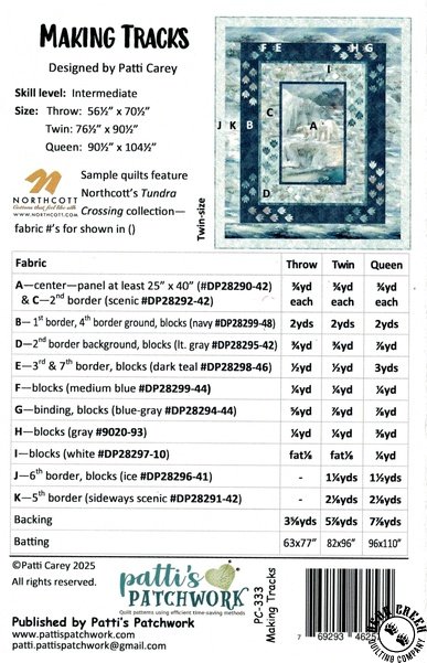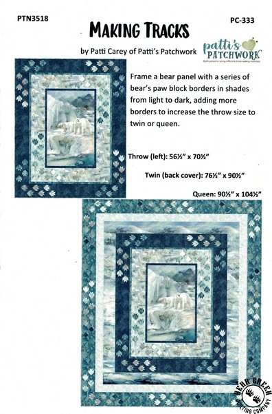 Making Tracks Quilt Pattern View Larger Image Price: SALE $9.09 4 item(s) available. Item # PTN-3518/PC-333 | Reg. $12.99 Tweet Pin It Making Tracks Quilt PatternFeaturing the Tundra Crossing fabric collection by Northcott. Pattern and instructions; fabric not included Finished size is: Throw = 56 1/2 inches by 70 1/2 inches Twin = 76 1/2 inches by 90 1/2 inches Queen = 90 1/2 inches by 104 1/2 inches Designed by Patti Carey Published by Patti's Patchwork Copyright 2025 Related Products Artic Breeze Quilt Pattern Item # PTN-3517 | Reg. $14.99 SALE from $10.49 Northcott Tundra Crossing Border Light Blue/Multi Item # DP28291-42 | Reg. $12.99 SALE from $9.09 Northcott Tundra Crossing Polar Bears Navy Item # DP28293-48 | Reg. $12.99 SALE from $9.09 Northcott Tundra Crossing Polar Bears White Item # DP28293-10 | Reg. $12.99 SALE from $9.09 Northcott Tundra Crossing Polar Panel Item # DP28290-42 $10.99 Tundra Crossing Quilt Pattern Item # PTN-3516 | Reg. $13.99 SALE from $9.79
