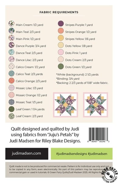 Mama Juju Quilt Pattern View Larger Image Price: SALE $9.59 10 item(s) available. Item # PTN-No.124 | Reg. $11.99 Tweet Pin It Mama Juju Quilt PatternFeaturing the Juju's Petals fabric collection Riley Blake Designs. Pattern and instructions; fabric not included Finished size is 84 inches by 84 inches Designed by Judi Madsen Published by Judi Madsen Designs Copyright 2025 Related Products Bohemian Quilt Pattern Item # PTN-No.101 | Reg. $11.99 SALE from $9.59 Butterfly Dance Quilt Pattern Item # PTN-No.122 | Reg. $11.99 SALE from $9.59 Butterfly Kisses Quilt Pattern Item # PTN-No.125 | Reg. $11.99 SALE from $9.59 Juju's Petals 10" Squares by Riley Blake Designs Item # 10-16610-42 | Reg. $49.99 SALE from $39.99 Juju's Petals Fat Quarter Bundle by Riley Blake Designs Item # FQ-16610-21 | Reg. $79.99 SALE from $63.99 Juju's Petals Quilt Pattern Item # PTN-No.123 | Reg. $11.99 SALE from $9.59 Juju's Petals Strip Roll by Riley Blake Designs Item # RP-16610-40 | Reg. $49.99 SALE from $39.99 Juju's Tiles Quilt Pattern Item # PTN-No.121 | Reg. $11.99 SALE from $9.59 Riley Blake Designs Juju's Petals Calico Cream Item # C16613-CREAM | Reg. $11.99 SALE from $9.59 Riley Blake Designs Juju's Petals Calico Orange Item # C16613-ORANGE | Reg. $11.99 SALE from $9.59 Riley Blake Designs Juju's Petals Calico Teal Item # C16613-TEAL | Reg. $11.99 SALE from $9.59 Riley Blake Designs Juju's Petals Dance Lilac Item # C16611-LILAC | Reg. $11.99 SALE from $9.59 Riley Blake Designs Juju's Petals Dance Purple Item # C16611-PURPLE | Reg. $11.99 SALE from $9.59 Riley Blake Designs Juju's Petals Dance Teal Item # C16611-TEAL | Reg. $11.99 SALE from $9.59 Riley Blake Designs Juju's Petals Dots Cream Item # C16616-CREAM | Reg. $11.99 SALE from $9.59 Riley Blake Designs Juju's Petals Dots Green Item # C16616-GREEN | Reg. $11.99 SALE from $9.59 Riley Blake Designs Juju's Petals Dots Pink Item # C16616-PINK | Reg. $11.99 SALE from $9.59 Riley Blake Designs Juju's Petals Dots Yellow Item # C16616-YELLOW | Reg. $11.99 SALE from $9.59 Riley Blake Designs Juju's Petals Leaves Cream Item # C16612-CREAM | Reg. $11.99 SALE from $9.59 Riley Blake Designs Juju's Petals Leaves Green Item # C16612-GREEN | Reg. $11.99 SALE from $9.59 Riley Blake Designs Juju's Petals Main Pink Item # C16610-PINK | Reg. $11.99 SALE from $9.59 Riley Blake Designs Juju's Petals Main Teal Item # C16610-TEAL | Reg. $11.99 SALE from $9.59 Riley Blake Designs Juju's Petals Mosaic Lilac Item # C16614-LILAC | Reg. $11.99 SALE from $9.59 Riley Blake Designs Juju's Petals Mosaic Orange Item # C16614-ORANGE | Reg. $11.99 SALE from $9.59 Riley Blake Designs Juju's Petals Mosaic Teal Item # C16614-TEAL | Reg. $11.99 SALE from $9.59 Riley Blake Designs Juju's Petals Stripes Orange Item # C16615-ORANGE | Reg. $11.99 SALE from $9.59 Riley Blake Designs Juju's Petals Stripes Purple Item # C16615-PURPLE | Reg. $11.99 SALE from $9.59 Riley Blake Designs Juju's Petals Stripes Yellow Item # C16615-YELLOW | Reg. $11.99 SALE from $9.59