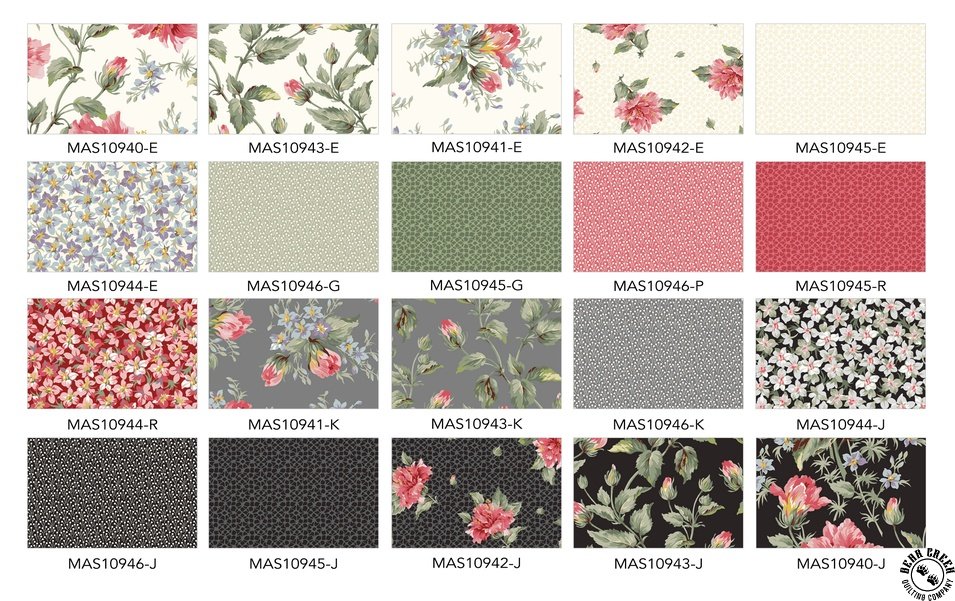 Marlowe captures the charm of vintage florals with bold, large-scale blooms and a rich palette of red, soft gray, black, and cream. The fabric collection features coordinating prints that blend delicate lace-like motifs with striking geometrics, complemented by lush packed florals and scattered bouquets. With its timeless designs and subtly retro hues, Marlowe brings a fresh, sophisticated touch to quilts, table runners, and handmade accessories.