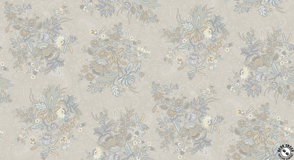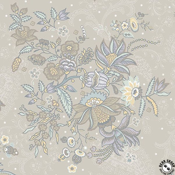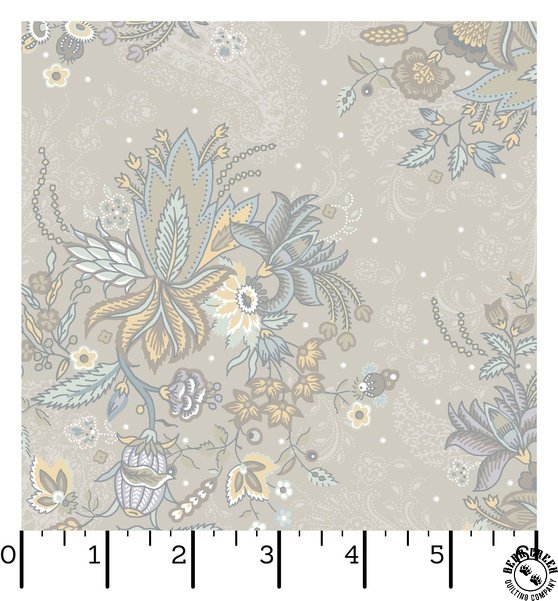 Daybreak  features intricate paisley patterns in a serene blend of soft cool grays and warm taupes, creating a delicate balance of warm and cool neutrals. The designs evoke the peaceful feeling of spending a quiet day in a shady spot with soft breezes and a good booklight, airy, and tranquil. The intricate patterns, combined with earthy soothing colors, bring a gentle elegance to any sewing project, whether for a lap quilt to relax under or a calming home accessory.