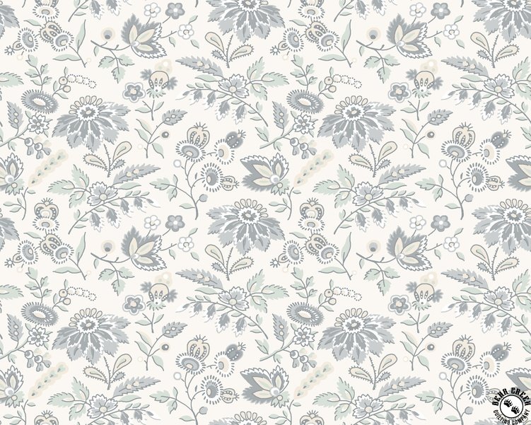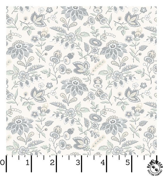 Daybreak  features intricate paisley patterns in a serene blend of soft cool grays and warm taupes, creating a delicate balance of warm and cool neutrals. The designs evoke the peaceful feeling of spending a quiet day in a shady spot with soft breezes and a good booklight, airy, and tranquil. The intricate patterns, combined with earthy soothing colors, bring a gentle elegance to any sewing project, whether for a lap quilt to relax under or a calming home accessory.
