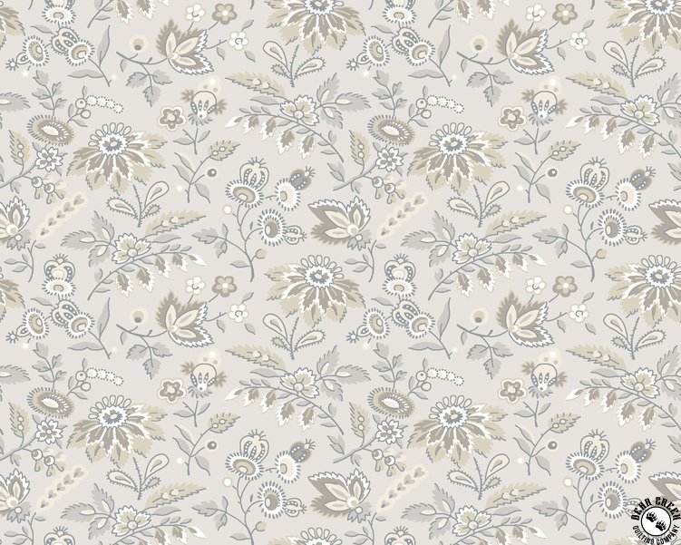 Daybreak  features intricate paisley patterns in a serene blend of soft cool grays and warm taupes, creating a delicate balance of warm and cool neutrals. The designs evoke the peaceful feeling of spending a quiet day in a shady spot with soft breezes and a good booklight, airy, and tranquil. The intricate patterns, combined with earthy soothing colors, bring a gentle elegance to any sewing project, whether for a lap quilt to relax under or a calming home accessory.