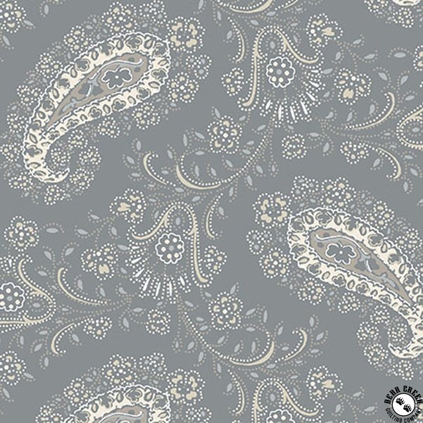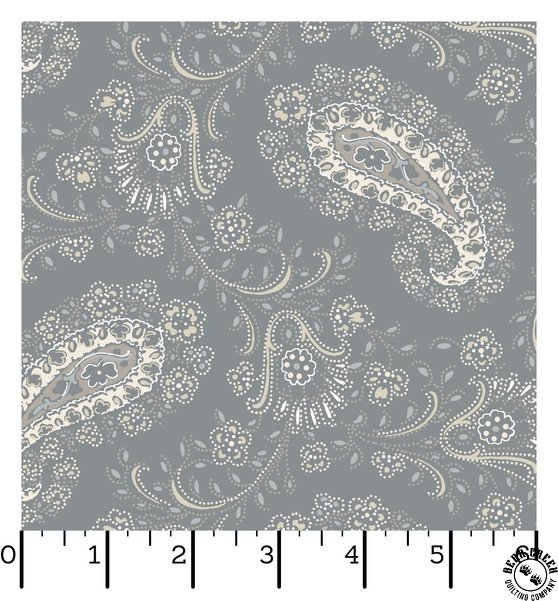 Daybreak  features intricate paisley patterns in a serene blend of soft cool grays and warm taupes, creating a delicate balance of warm and cool neutrals. The designs evoke the peaceful feeling of spending a quiet day in a shady spot with soft breezes and a good booklight, airy, and tranquil. The intricate patterns, combined with earthy soothing colors, bring a gentle elegance to any sewing project, whether for a lap quilt to relax under or a calming home accessory.