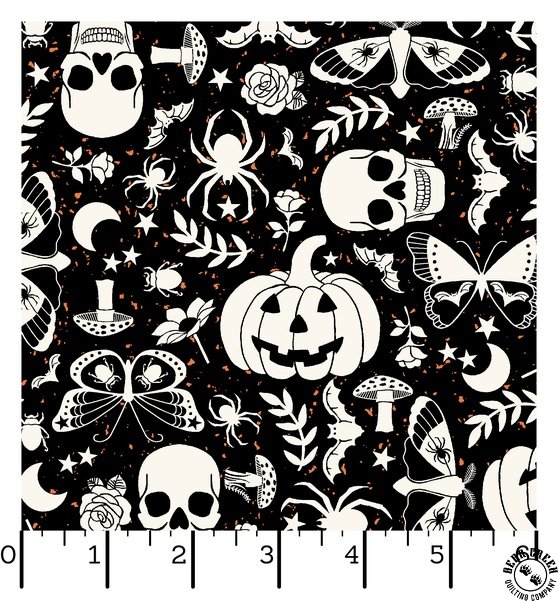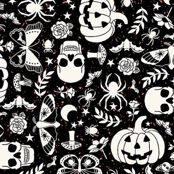 Step into a moonlit garden where smiling skulls, glowing jack-o’-lanterns, haunted roses, and eerie crawlies await.  This chillingly charming collection is brought to life with flecked blender fabrics in shades of orange, black, and white—adding depth and texture to every design.  Featuring a haunting mix of large, medium, and small-scale prints that pair perfectly together, Goth Gardens  is sure to make you shiver with anticipation...in the best way.