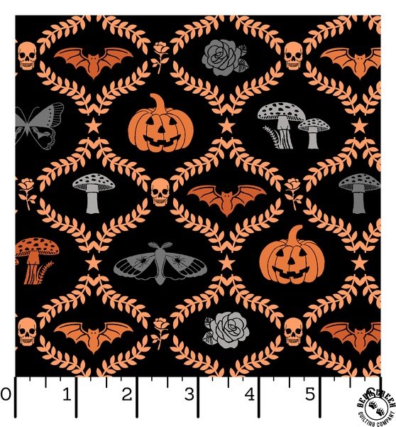Step into a moonlit garden where smiling skulls, glowing jack-o’-lanterns, haunted roses, and eerie crawlies await.  This chillingly charming collection is brought to life with flecked blender fabrics in shades of orange, black, and white—adding depth and texture to every design.  Featuring a haunting mix of large, medium, and small-scale prints that pair perfectly together, Goth Gardens  is sure to make you shiver with anticipation...in the best way.