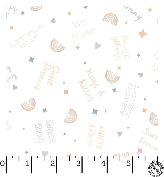 offers a soothing palette designed for all the wee dreamers, with gentle greys, soft peaches, and delicate whites.  Playful scenes of rainbows and hot air balloons capture the magic of childhood adventures, while floppy ears and fluffy clouds add a whimsical charm.  Perfect for stitching sweet nursery quilts and heartfelt baby gifts, Honey Bunny  invites you to create cozy, handmade treasures for the littlest ones in your life.
