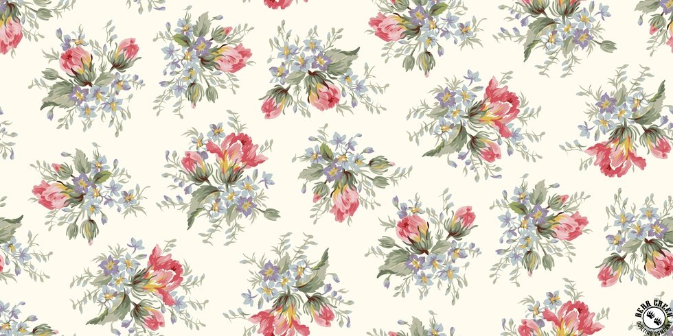 Marlowe  captures the charm of vintage florals with bold, large-scale blooms and a rich palette of red, soft gray, black, and cream.  The fabric collection features coordinating prints that blend delicate lace-like motifs with striking geometrics, complemented by lush packed florals and scattered bouquets.  With its timeless designs and subtly retro hues, Marlowe  brings a fresh, sophisticated touch to quilts, table runners, and handmade accessories.