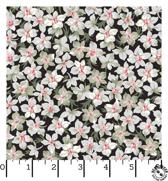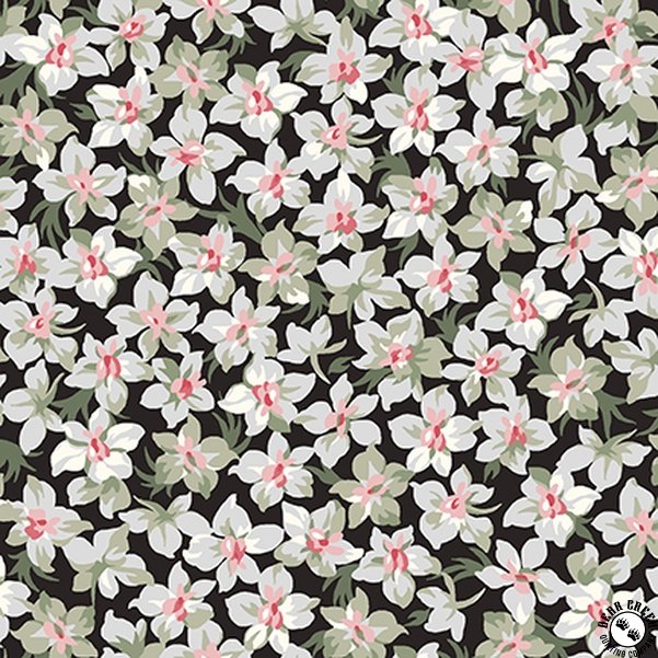 Marlowe  captures the charm of vintage florals with bold, large-scale blooms and a rich palette of red, soft gray, black, and cream.  The fabric collection features coordinating prints that blend delicate lace-like motifs with striking geometrics, complemented by lush packed florals and scattered bouquets.  With its timeless designs and subtly retro hues, Marlowe  brings a fresh, sophisticated touch to quilts, table runners, and handmade accessories.