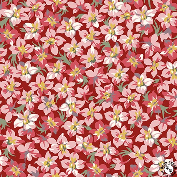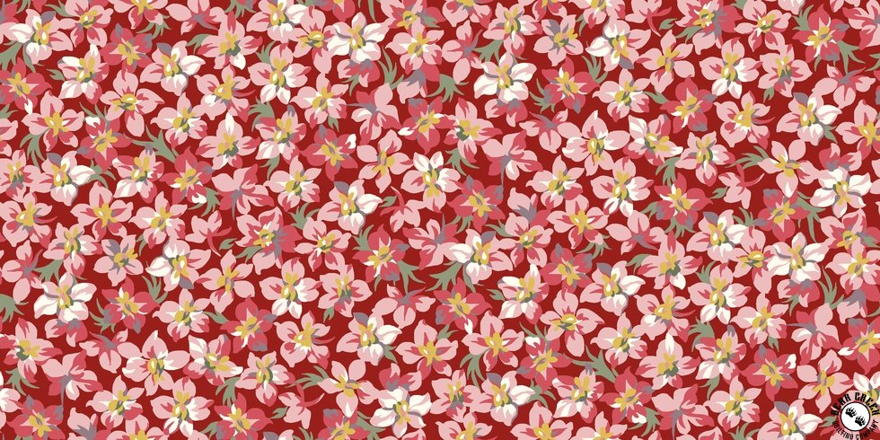 Marlowe  captures the charm of vintage florals with bold, large-scale blooms and a rich palette of red, soft gray, black, and cream.  The fabric collection features coordinating prints that blend delicate lace-like motifs with striking geometrics, complemented by lush packed florals and scattered bouquets.  With its timeless designs and subtly retro hues, Marlowe  brings a fresh, sophisticated touch to quilts, table runners, and handmade accessories.