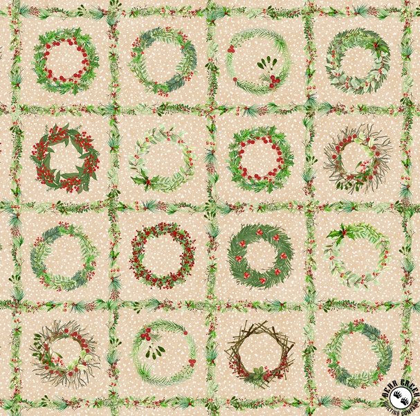 Bring the beauty of nature indoors this holiday season with Winter Wreaths  from Maywood Studio.  Brimming with twigs, sprigs, and berries, this collection offers everything you need for festive projects, printed on soft natural creams, rustic reds, and muted greens.  The running yardage features blocks of unique wreath designs — perfect as quilt cornerstones, block centers, or charming focal points in your seasonal creations.