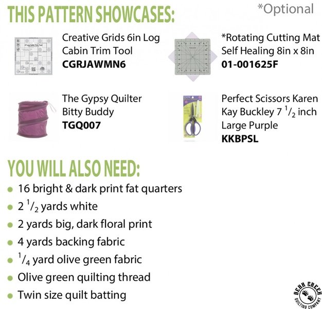 Midnight In The Garden Quilt Pattern View Larger Image Price: SALE $2.79 1 item(s) available. Item # PTN-CLPJAW043 | Reg. $3.99 Tweet Pin It Midnight In The Garden Quilt Pattern Pattern and instructions; fabric not included Fat Quarter friendly Finished quilt size is 60 inches by 66 inches Designed by Jean Ann Wright Published by Cut Loose Press Copyright 2018 Required tools: Creative Grids Log Cabin Trim Tool 6 Inch; sold separately