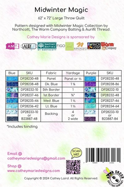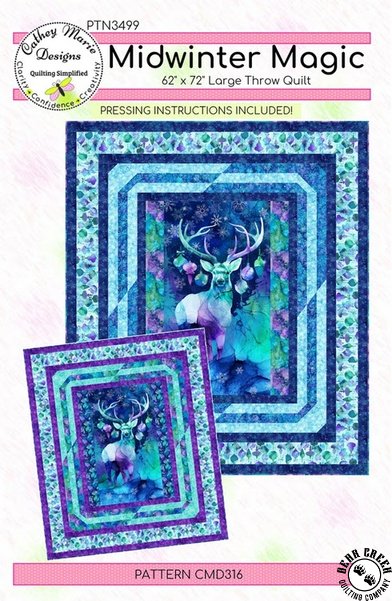 Midwinter Magic Quilt Pattern View Larger Image Price: SALE $9.79 2 item(s) available. Item # PTN-3499/CMD316 | Reg. $13.99 Pin It Midwinter Magic Quilt PatternFeaturing the Midwinter Magic fabric collection by Northcott. Pattern and instructions; fabric not included Finished size is 62 inches by 72 inches Designed by Cathey Laird Published by Cathey Marie Designs Copyright 2025