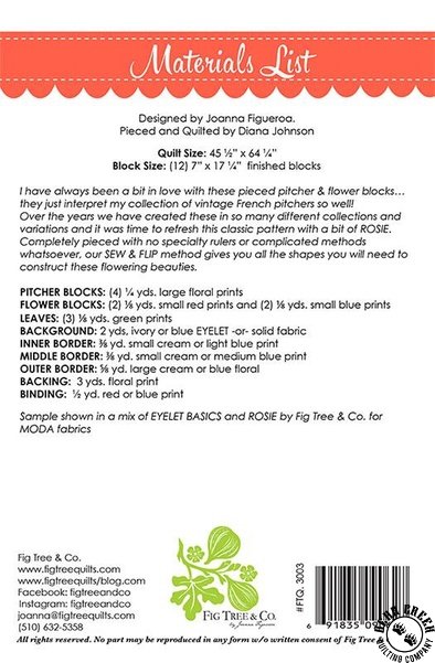 Milk and Blossoms Quilt Pattern View Larger Image Price: $11.99 11 item(s) available. Item # PTN-FTQ-3003 Pin It Milk and Blossoms Quilt PatternFeaturing the Rosie fabric collection by Moda. Pattern and instructions; fabric not included Finished size is 45 1/2 inches by 64 3/4 inches Designed by Joanna Figueroa Published by Fig Tree Quilts Copyright 2026 Related Products For Rosie Quilt Kit Item # KIT-35420 $149.99 Moda Rose Twinkling Star Whipped Cream Item # 35422-11 $12.99 Moda Rosie 108 Inch Wide Backing Fabric Country Rose Denim Jeans Item # 108038-19 $0.00 Moda Rosie 108 Inch Wide Backing Fabric Country Rose Strawberry Item # 108038-14 $0.00 Moda Rosie 108 Inch Wide Backing Fabric Country Rose Whipped Cream Item # 108038-11 $0.00 Moda Rosie Country Rose Blueberry Item # 35420-18 $12.99 Moda Rosie Country Rose Denim Jeans Item # 35420-19 $12.99 Moda Rosie Country Rose Rose Item # 35420-13 $12.99 Moda Rosie Country Rose Strawberry Item # 35420-14 $12.99 Moda Rosie Country Rose Whipped Cream Item # 35420-11 $12.99 Moda Rosie Eyelet Denim Jeans Item # 20488-129 $12.99 Moda Rosie Eyelet Forget Me Not Item # 20488-126 $12.99 Moda Rosie Gingham Denim Jeans Item # 35427-29 $12.99 Moda Rosie Gingham Rose Item # 35427-23 $12.99 Moda Rosie Gingham Strawberry Item # 35427-24 $12.99 Moda Rosie Nana's Apron Blueberry Item # 35421-18 $12.99 Moda Rosie Nana's Apron Whipped Cream Item # 35421-11 $12.99 Moda Rosie Picnic Bloom Garden Path Item # 35424-12 $12.99 Moda Rosie Picnic Bloom Green Apple Item # 35424-20 $12.99 Moda Rosie Picnic Bloom Strawberry Item # 35424-14 $12.99 Moda Rosie Prairie Toss Denim Jeans Item # 35425-19 $12.99 Moda Rosie Prairie Toss Green Apple Item # 35425-20 $12.99 Moda Rosie Vintage Linen Strawberry Item # 35423-24 $12.99 Moda Rosie Vintage Linen Whipped Cream Item # 35423-11 $12.99 Rosie Charm Pack by Moda Item # 35420PP $12.99 Rosie Fat Quarter Bundle by Moda Item # 35420AB $179.99 Rosie Jelly Roll by Moda Item # 35420JR $49.99 Rosie Layer Cake by Moda Item # 35420LC $49.99