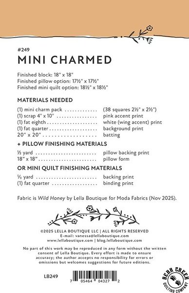 Mini Charmed Quilt Pattern View Larger Image Price: $11.99 1 item(s) available. Item # PTN-249 Pin It Mini Charmed Quilt PatternFeaturing the Wild Honey fabric collection by Moda. Pattern and instructions; fabric not included Finished size is 17 1/2 inches by 17 1/2 inches Designed by Vanessa Goerzten Published by Lella Boutique Copyright 2025 Related Products Bloom and Buzz Quilt Pattern Item # PTN-247 $11.99 Dreamer Quilt Pattern Item # PTN-246 $11.99 Moda Wild Honey Bumbling Posies Carnation Item # 5252-12 $12.99 Moda Wild Honey Bumbling Posies Daisy Item # 5252-11 $12.99 Moda Wild Honey Bumbling Posies Fern Item # 5252-15 $12.99 Moda Wild Honey Bumbling Posies Honey Item # 5252-16 $12.99 Moda Wild Honey Bumbling Posies Rose Water Item # 5252-13 $12.99 Moda Wild Honey Bumbling Posies sky Item # 5252-14 $12.99 Moda Wild Honey Buzz Words Daisy Item # 5254-11 $12.99 Moda Wild Honey Buzz Words Fern Item # 5254-15 $12.99 Moda Wild Honey Buzz Words Honey Item # 5254-16 $12.99 Moda Wild Honey Buzz Words Rose Water Item # 5254-13 $12.99 Moda Wild Honey Buzz Words Sky Item # 5254-14 $12.99 Moda Wild Honey Honeycomb Carnation Item # 5253-12 $12.99 Moda Wild Honey Honeycomb Daisy/White Item # 5253-21 $12.99 Moda Wild Honey Honeycomb Fern Item # 5253-15 $12.99 Moda Wild Honey Honeycomb Honey Item # 5253-16 $12.99 Moda Wild Honey Honeycomb Sky Item # 5253-14 $12.99 Moda Wild Honey Magic Dot Breeze Item # 5230-54 $12.99 Moda Wild Honey Magic Dot Carnation Item # 5230-52 $12.99 Moda Wild Honey Magic Dot Fern Item # 5230-19 $12.99 Moda Wild Honey Magic Dot Honey Item # 5230-56 $12.99 Moda Wild Honey Magic Dot Rose Water Item # 5230-53 $12.99 Moda Wild Honey Monofloral Fern Item # 5251-15 $12.99 Moda Wild Honey Monofloral Honey Item # 5251-16 $12.99 Moda Wild Honey Monofloral Rose Water Item # 5251-13 $12.99 Moda Wild Honey Monofloral Sky Item # 5251-14 $12.99 Moda Wild Honey Wildflower Dance Carnation Item # 5250-12 $12.99 Moda Wild Honey Wildflower Dance Honey Item # 5250-16 $12.99 Vintage Blooms Quilt Pattern Item # PTN-250 $11.99 Wild Honey Fat Quarter Bundle by Moda Item # 5250AB $149.99 Wild Honey Jelly Roll by Moda Item # 5250JR $49.99 Wild Honey Layer Cake by Moda Item # 5250LC $49.99