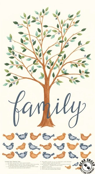 My husband, Scott, and I love to travel to shops and quilt guilds around the country and share my design process. We have done over 100 of these presentations and trunk shows! Over the years, one fabric collection is always asked about from the past…my Family Tree collection! Even though it is from MANY years ago, quilters always want to know if it is still available. So, we have decided to do a new version of this beloved favorite! The panel provides a blank “Family Tree” to fill with birds (also provided) that can be personalized with names of those you love. I’ve painted this new version in muted watercolors, giving a softer, more updated feel to the entire collection. What a better way to create a family heirloom than creating a quilt, wall-hanging, or table runner about your family? After all, families, like quilts, truly are forever!
