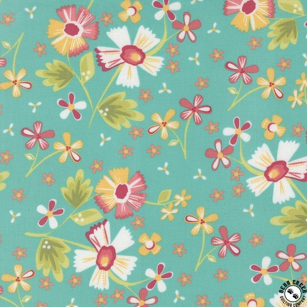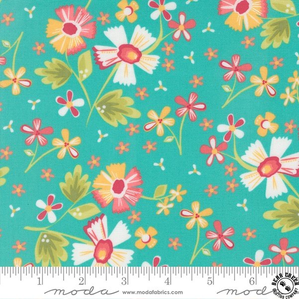 In the Garden  fabric collection features a rainbow of the warm colors that I so enjoy sewing with… pinks, corals, yellows, greens, and aquas.  Ever since my first collection, I have also enjoyed how nicely a warm gray plays with all of those sherbet brights.  You will find my beautiful signature grays in this collection.  Over the years, I have often joked that I can’t grow a beautiful flower garden outside (this girl does not have a green thumb!) but I can create flower-filled fabrics!  In the Garden is bursting with flowers; wildflowers, daisies, blossoms, and buds are spread throughout.