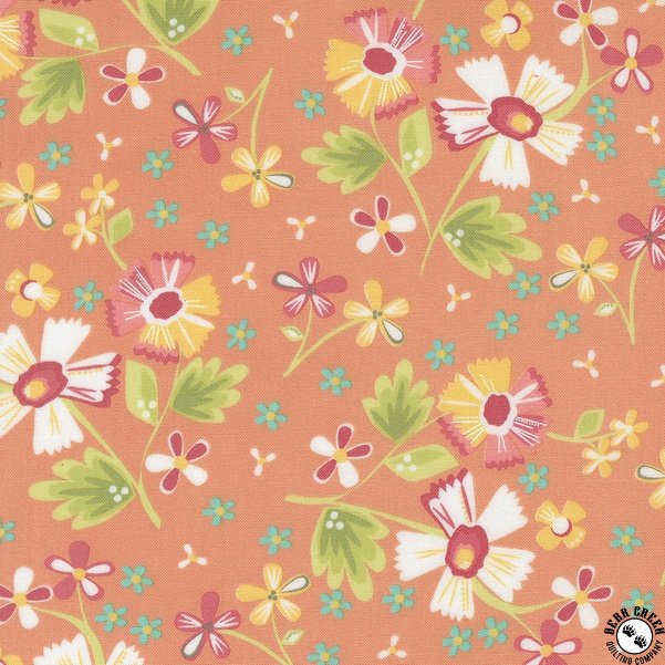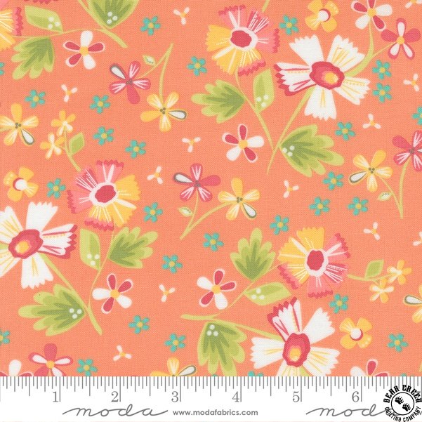 In the Garden  fabric collection features a rainbow of the warm colors that I so enjoy sewing with… pinks, corals, yellows, greens, and aquas.  Ever since my first collection, I have also enjoyed how nicely a warm gray plays with all of those sherbet brights.  You will find my beautiful signature grays in this collection.  Over the years, I have often joked that I can’t grow a beautiful flower garden outside (this girl does not have a green thumb!) but I can create flower-filled fabrics!  In the Garden is bursting with flowers; wildflowers, daisies, blossoms, and buds are spread throughout.